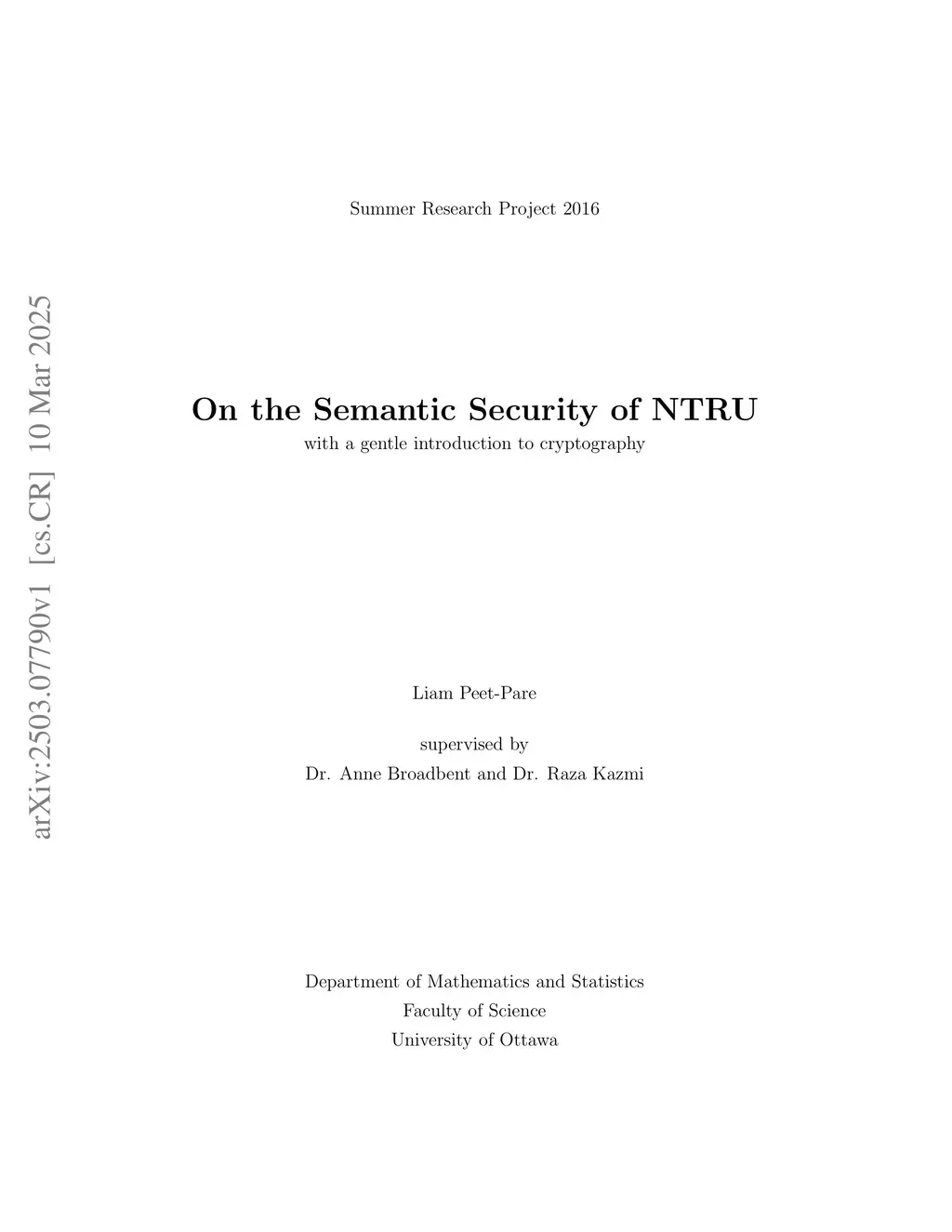This paper provides an explanation of NTRU, a post quantum encryption scheme, while also providing a gentle introduction to cryptography. NTRU is a very efficient lattice based cryptosystem that appears to be safe against attacks by quantum computers. NTRU's efficiency suggests that it is a strong candidate as an alternative to RSA, ElGamal, and ECC for the post quantum world. The paper begins with an introduction to cryptography and security proofs for cryptographic schemes before explaining the NTRU cryptosystem and culminating with a proof that the original presentation of NTRU is not IND-CPA secure. We will conclude by mentioning padding schemes to NTRU that are provably IND-CCA2 secure in the random oracle model. The paper is designed to be accessible to anyone with minimal background in abstract algebra and number theory - no previous knowledge of cryptography is assumed. Given the author's lack of familiarity with the subject, this paper aims to be an expository work rather than to provide new insights to the subject matter.
