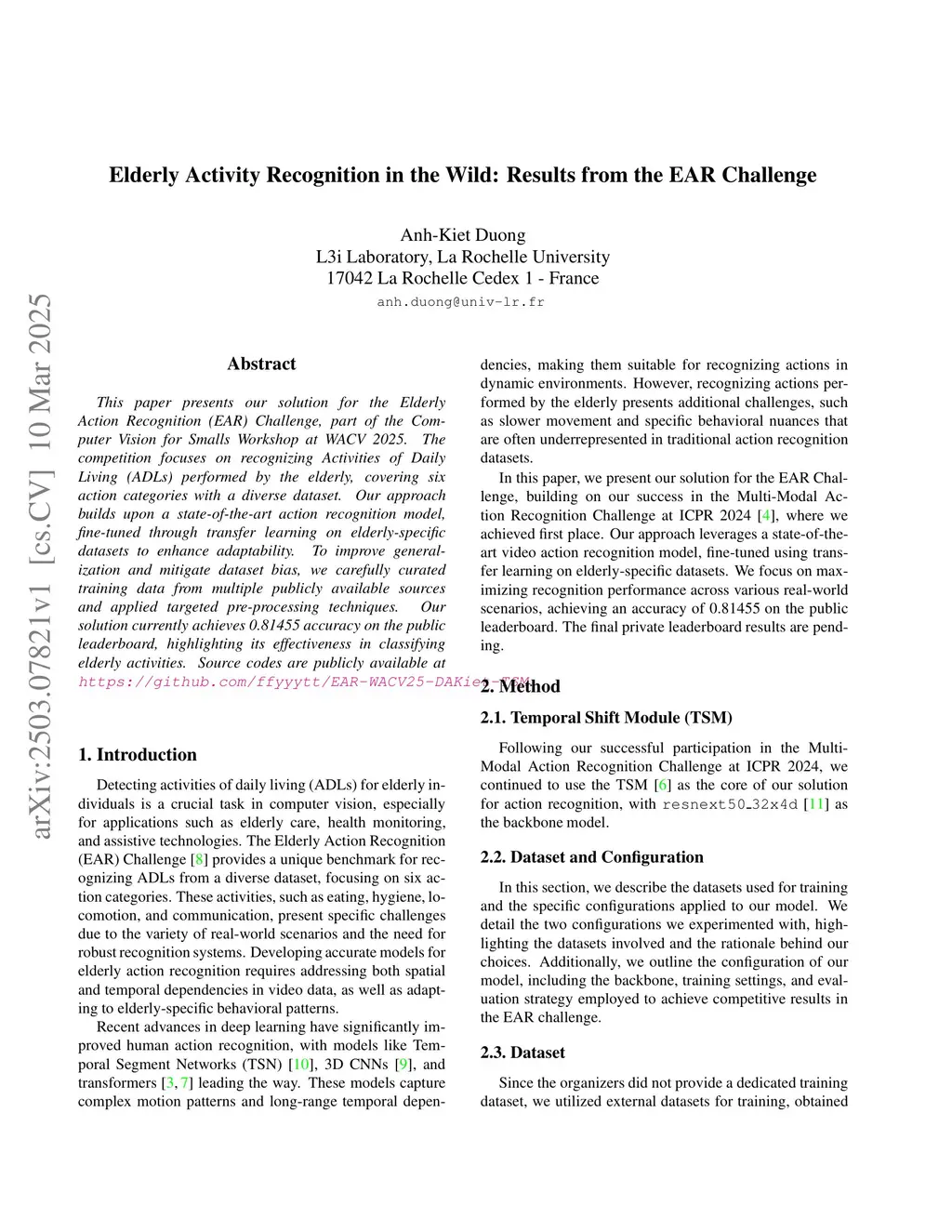 This paper presents our solution for the Elderly Action Recognition (EAR) Challenge, part of the Computer Vision for Smalls Workshop at WACV 2025. The competition focuses on recognizing Activities of Daily Living (ADLs) performed by the elderly, covering six action categories with a diverse dataset. Our approach builds upon a state-of-the-art action recognition model, fine-tuned through transfer learning on elderly-specific datasets to enhance adaptability. To improve generalization and mitigate dataset bias, we carefully curated training data from multiple publicly available sources and applied targeted pre-processing techniques. Our solution currently achieves 0.81455 accuracy on the public leaderboard, highlighting its effectiveness in classifying elderly activities. Source codes are publicly available atthis https URL.
