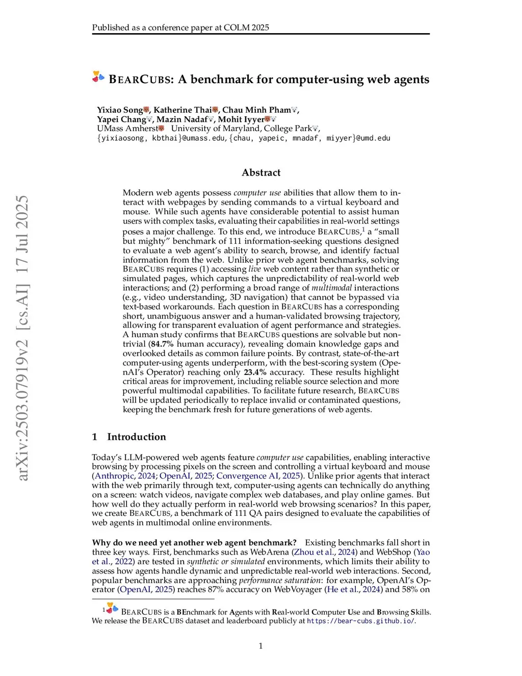 Modern web agents possess computer use abilities that allow them to interact with webpages by sending commands to a virtual keyboard and mouse. While such agents have considerable potential to assist human users with complex tasks, evaluating their capabilities in real-world settings poses a major challenge. To this end, we introduce BEARCUBS, a "smallbut mighty" benchmark of 111 information-seeking questions designed to evaluate a web agent's ability to search, browse, and identify factual information from the web. Unlike prior web agent benchmarks, solving BEARCUBS requires (1) accessing live web content rather than synthetic or simulated pages, which captures the unpredictability of real-world web interactions; and (2) performing a broad range of multimodal interactions (e.g., video understanding, 3D navigation) that cannot be bypassed via text-based workarounds. Each question in BEARCUBS has a corresponding short, unambiguous answer and a human-validated browsing trajectory, allowing for transparent evaluation of agent performance and strategies. A human study confirms that BEARCUBS questions are solvable but non-trivial (84.7% human accuracy), revealing domain knowledge gaps and overlooked details as common failure points. We find that ChatGPT Agent significantly outperforms other computer-using agents with an overall accuracy of 65.8% (compared to e.g., Operator's 23.4%), showcasing substantial progress in tasks involving real computer use, such as playing web games and navigating 3D environments. Nevertheless, closing the gap to human performance requires improvements in areas like fine control, complex data filtering, and execution speed. To facilitate future research, BEARCUBS will be updated periodically to replace invalid or contaminated questions, keeping the benchmark fresh for future generations of web agents.