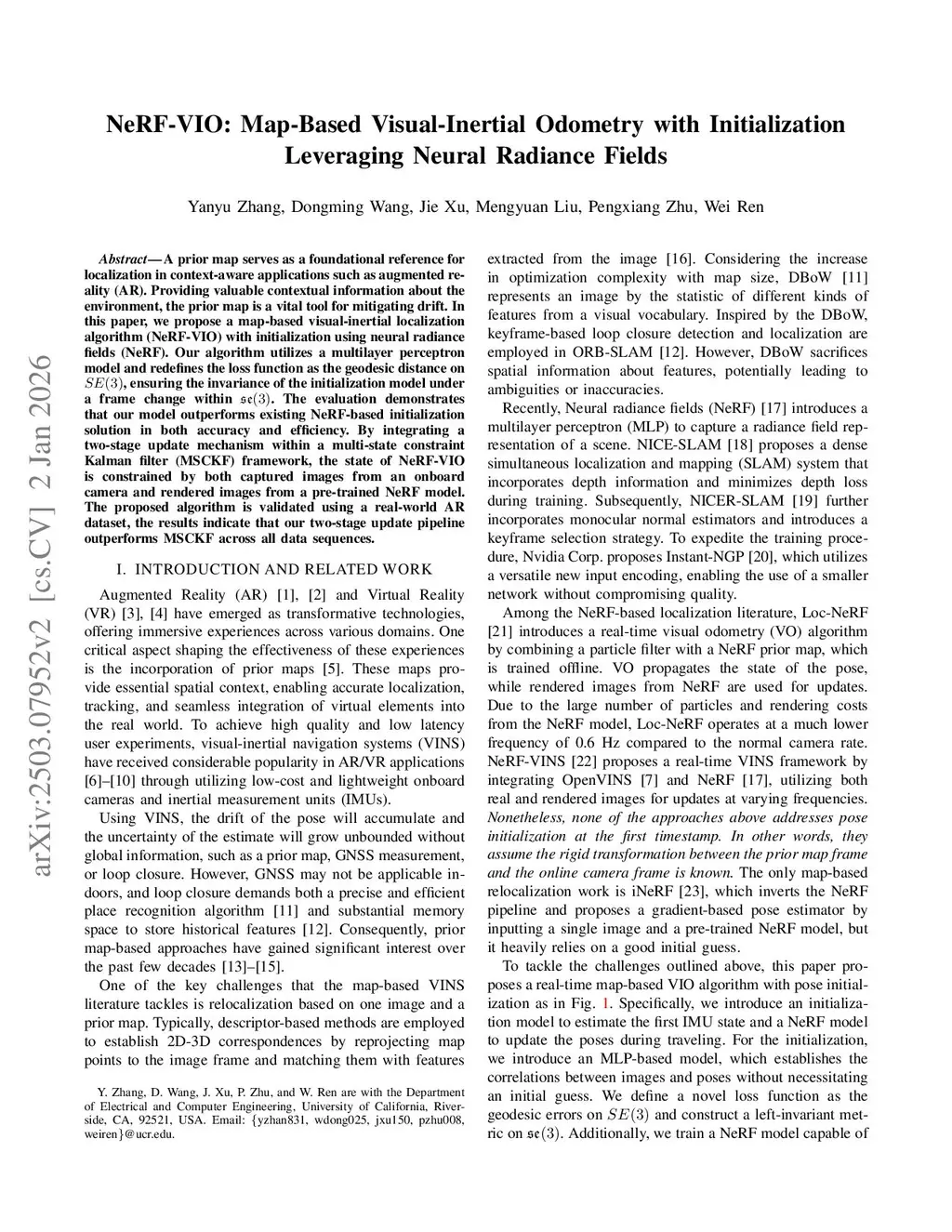 A prior map serves as a foundational reference for localization in context-aware applications such as augmented reality (AR). Providing valuable contextual information about the environment, the prior map is a vital tool for mitigating drift. In this paper, we propose a map-based visual-inertial localization algorithm (NeRF-VIO) with initialization using neural radiance fields (NeRF). Our algorithm utilizes a multilayer perceptron model and redefines the loss function as the geodesic distance on \(SE(3)\), ensuring the invariance of the initialization model under a frame change within \(\mathfrak{se}(3)\). The evaluation demonstrates that our model outperforms existing NeRF-based initialization solution in both accuracy and efficiency. By integrating a two-stage update mechanism within a multi-state constraint Kalman filter (MSCKF) framework, the state of NeRF-VIO is constrained by both captured images from an onboard camera and rendered images from a pre-trained NeRF model. The proposed algorithm is validated using a real-world AR dataset, the results indicate that our two-stage update pipeline outperforms MSCKF across all data sequences.
