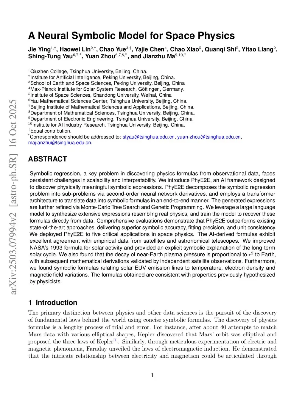 In this study, we unveil a new AI model, termed PhyE2E, to discover physical formulas through symbolic regression. PhyE2E simplifies symbolic regression by decomposing it into sub-problems using the second-order derivatives of an oracle neural network, and employs a transformer model to translate data into symbolic formulas in an end-to-end manner. The resulting formulas are refined through Monte-Carlo Tree Search and Genetic Programming. We leverage a large language model to synthesize extensive symbolic expressions resembling real physics, and train the model to recover these formulas directly from data. A comprehensive evaluation reveals that PhyE2E outperforms existing state-of-the-art approaches, delivering superior symbolic accuracy, precision in data fitting, and consistency in physical units. We deployed PhyE2E to five applications in space physics, including the prediction of sunspot numbers, solar rotational angular velocity, emission line contribution functions, near-Earth plasma pressure, and lunar-tide plasma signals. The physical formulas generated by AI demonstrate a high degree of accuracy in fitting the experimental data from satellites and astronomical telescopes. We have successfully upgraded the formula proposed by NASA in 1993 regarding solar activity, and for the first time, provided the explanations for the long cycle of solar activity in an explicit form. We also found that the decay of near-Earth plasma pressure is proportional to r^2 to Earth, where subsequent mathematical derivations are consistent with satellite data from another independent study. Moreover, we found physical formulas that can describe the relationships between emission lines in the extreme ultraviolet spectrum of the Sun, temperatures, electron densities, and magnetic fields. The formula obtained is consistent with the properties that physicists had previously hypothesized it should possess.