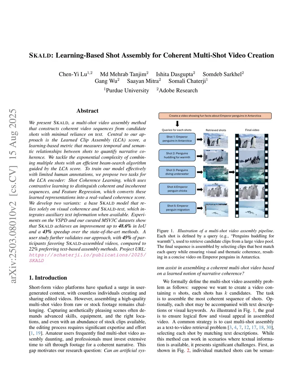 We present SKALD, a multi-shot video assembly method that constructs coherent video sequences from candidate shots with minimal reliance on text. Central to our approach is the Learned Clip Assembly (LCA) score, a learning-based metric that measures temporal and semantic relationships between shots to quantify narrative coherence. We tackle the exponential complexity of combining multiple shots with an efficient beam-search algorithm guided by the LCA score. To train our model effectively with limited human annotations, we propose two tasks for the LCA encoder: Shot Coherence Learning, which uses contrastive learning to distinguish coherent and incoherent sequences, and Feature Regression, which converts these learned representations into a real-valued coherence score. We develop two variants: a base SKALD model that relies solely on visual coherence and SKALD-text, which integrates auxiliary text information when available. Experiments on the VSPD and our curated MSV3C datasets show that SKALD achieves an improvement of up to 48.6% in IoU and a 43% speedup over the state-of-the-art methods. A user study further validates our approach, with 45% of participants favoring SKALD-assembled videos, compared to 22% preferring text-based assembly methods.