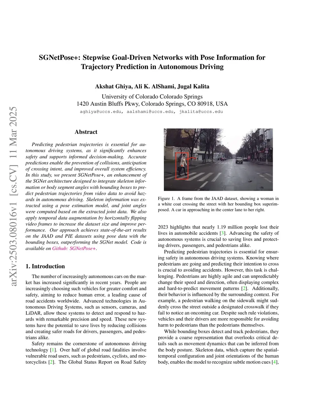 Predicting pedestrian trajectories is essential for autonomous driving systems, as it significantly enhances safety and supports informed decision-making. Accurate predictions enable the prevention of collisions, anticipation of crossing intent, and improved overall system efficiency. In this study, we present SGNetPose+, an enhancement of the SGNet architecture designed to integrate skeleton information or body segment angles with bounding boxes to predict pedestrian trajectories from video data to avoid hazards in autonomous driving. Skeleton information was extracted using a pose estimation model, and joint angles were computed based on the extracted joint data. We also apply temporal data augmentation by horizontally flipping video frames to increase the dataset size and improve performance. Our approach achieves state-of-the-art results on the JAAD and PIE datasets using pose data with the bounding boxes, outperforming the SGNet model. Code is available on Github: SGNetPose+.