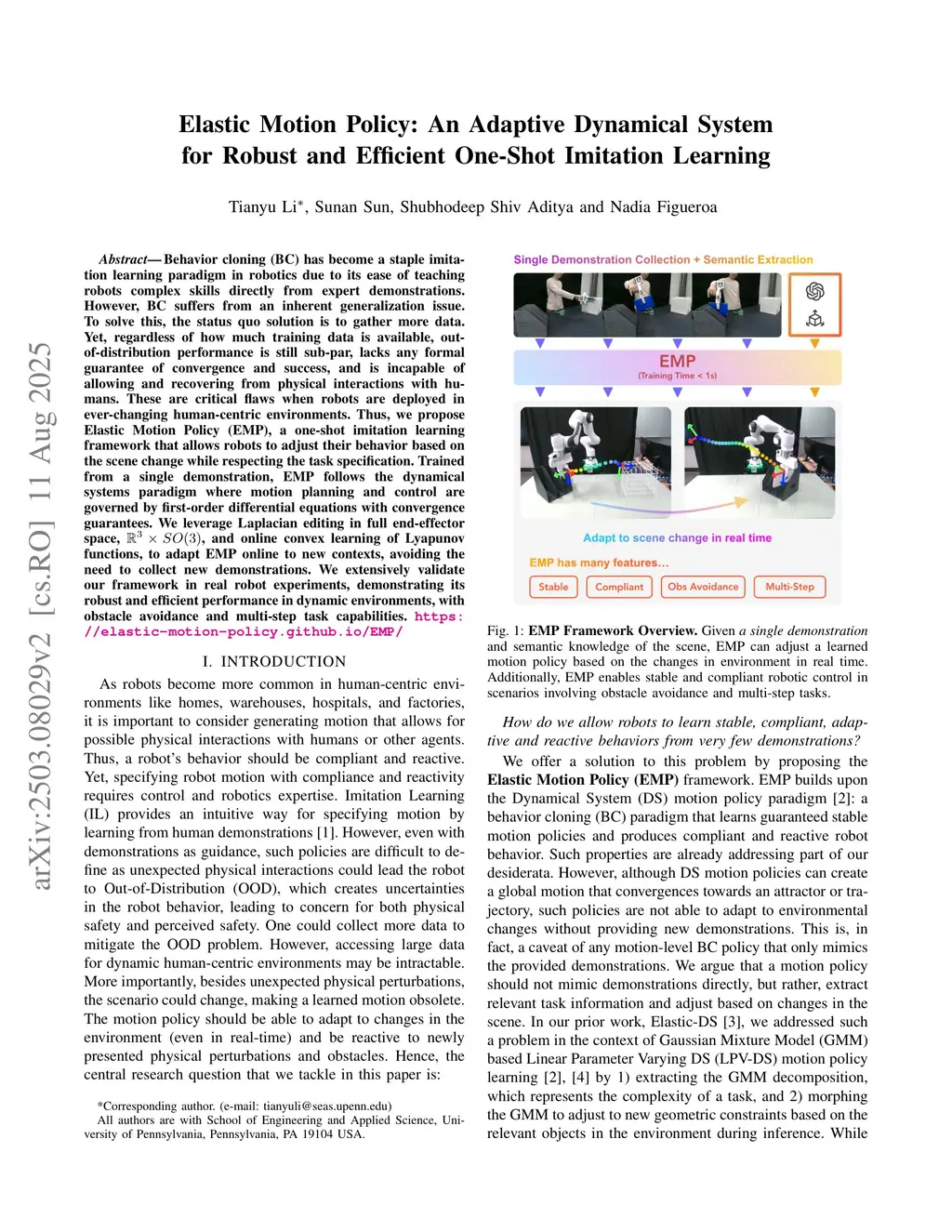 Behavior cloning (BC) has become a staple imitation learning paradigm in robotics due to its ease of teaching robots complex skills directly from expert demonstrations. However, BC suffers from an inherent generalization issue. To solve this, the status quo solution is to gather more data. Yet, regardless of how much training data is available, out-of-distribution performance is still sub-par, lacks any formal guarantee of convergence and success, and is incapable of allowing and recovering from physical interactions with humans. These are critical flaws when robots are deployed in ever-changing human-centric environments. Thus, we propose Elastic Motion Policy (EMP), a one-shot imitation learning framework that allows robots to adjust their behavior based on the scene change while respecting the task specification. Trained from a single demonstration, EMP follows the dynamical systems paradigm where motion planning and control are governed by first-order differential equations with convergence guarantees. We leverage Laplacian editing in full end-effector space, , and online convex learning of Lyapunov functions, to adapt EMP online to new contexts, avoiding the need to collect new demonstrations. We extensively validate our framework in real robot experiments, demonstrating its robust and efficient performance in dynamic environments, with obstacle avoidance and multi-step task capabilities. Project Website:this https URL