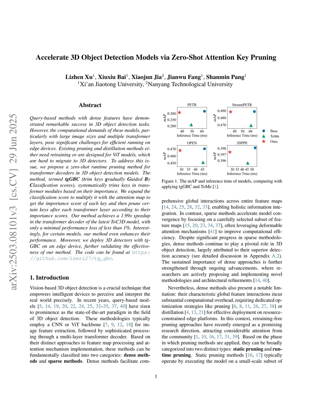 Query-based methods with dense features have demonstrated remarkable success in 3D object detection tasks. However, the computational demands of these models, particularly with large image sizes and multiple transformer layers, pose significant challenges for efficient running on edge devices. Existing pruning and distillation methods either need retraining or are designed for ViT models, which are hard to migrate to 3D detectors. To address this issue, we propose a zero-shot runtime pruning method for transformer decoders in 3D object detection models. The method, termed tgGBC (trim keys gradually Guided By Classification scores), systematically trims keys in transformer modules based on their importance. We expand the classification score to multiply it with the attention map to get the importance score of each key and then prune certain keys after each transformer layer according to their importance scores. Our method achieves a 1.99x speedup in the transformer decoder of the latest ToC3D model, with only a minimal performance loss of less than 1%. Interestingly, for certain models, our method even enhances their performance. Moreover, we deploy 3D detectors with tgGBC on an edge device, further validating the effectiveness of our method. The code can be found atthis https URL.