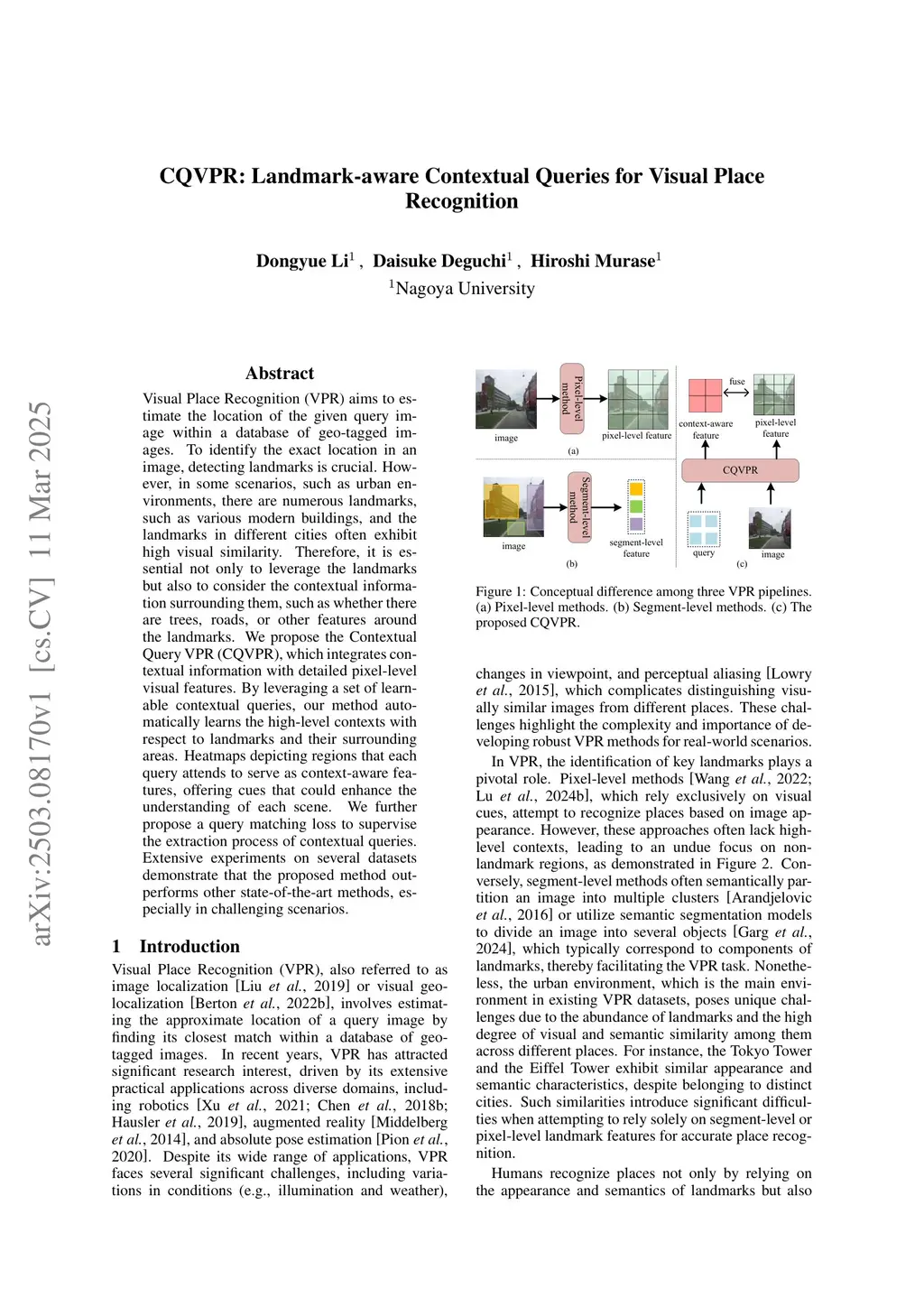 Visual Place Recognition (VPR) aims to estimate the location of the given query image within a database of geo-tagged images. To identify the exact location in an image, detecting landmarks is crucial. However, in some scenarios, such as urban environments, there are numerous landmarks, such as various modern buildings, and the landmarks in different cities often exhibit high visual similarity. Therefore, it is essential not only to leverage the landmarks but also to consider the contextual information surrounding them, such as whether there are trees, roads, or other features around the landmarks. We propose the Contextual Query VPR (CQVPR), which integrates contextual information with detailed pixel-level visual features. By leveraging a set of learnable contextual queries, our method automatically learns the high-level contexts with respect to landmarks and their surrounding areas. Heatmaps depicting regions that each query attends to serve as context-aware features, offering cues that could enhance the understanding of each scene. We further propose a query matching loss to supervise the extraction process of contextual queries. Extensive experiments on several datasets demonstrate that the proposed method outperforms other state-of-the-art methods, especially in challenging scenarios.
