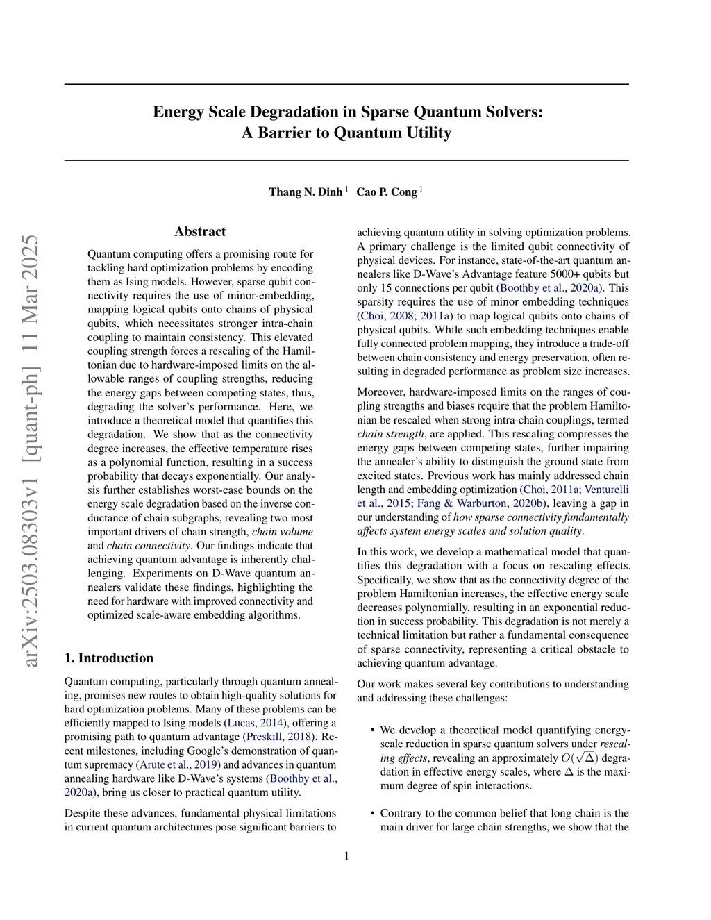 Quantum computing offers a promising route for tackling hard optimization problems by encoding them as Ising models. However, sparse qubit connectivity requires the use of minor-embedding, mapping logical qubits onto chains of physical qubits, which necessitates stronger intra-chain coupling to maintain consistency. This elevated coupling strength forces a rescaling of the Hamiltonian due to hardware-imposed limits on the allowable ranges of coupling strengths, reducing the energy gaps between competing states, thus, degrading the solver's performance. Here, we introduce a theoretical model that quantifies this degradation. We show that as the connectivity degree increases, the effective temperature rises as a polynomial function, resulting in a success probability that decays exponentially. Our analysis further establishes worst-case bounds on the energy scale degradation based on the inverse conductance of chain subgraphs, revealing two most important drivers of chain strength, \textit{chain volume} and \textit{chain connectivity}. Our findings indicate that achieving quantum advantage is inherently challenging. Experiments on D-Wave quantum annealers validate these findings, highlighting the need for hardware with improved connectivity and optimized scale-aware embedding algorithms.