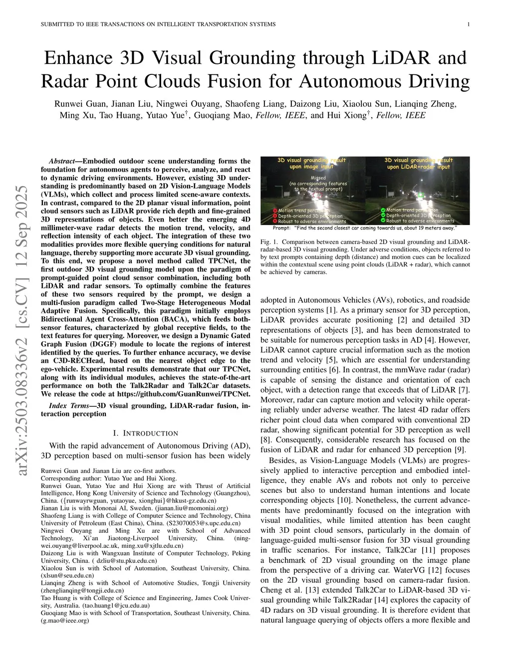 Embodied outdoor scene understanding forms the foundation for autonomous agents to perceive, analyze, and react to dynamic driving environments. However, existing 3D understanding is predominantly based on 2D Vision-Language Models (VLMs), which collect and process limited scene-aware contexts. In contrast, compared to the 2D planar visual information, point cloud sensors such as LiDAR provide rich depth and fine-grained 3D representations of objects. Even better the emerging 4D millimeter-wave radar detects the motion trend, velocity, and reflection intensity of each object. The integration of these two modalities provides more flexible querying conditions for natural language, thereby supporting more accurate 3D visual grounding. To this end, we propose a novel method called TPCNet, the first outdoor 3D visual grounding model upon the paradigm of prompt-guided point cloud sensor combination, including both LiDAR and radar sensors. To optimally combine the features of these two sensors required by the prompt, we design a multi-fusion paradigm called Two-Stage Heterogeneous Modal Adaptive Fusion. Specifically, this paradigm initially employs Bidirectional Agent Cross-Attention (BACA), which feeds both-sensor features, characterized by global receptive fields, to the text features for querying. Moreover, we design a Dynamic Gated Graph Fusion (DGGF) module to locate the regions of interest identified by the queries. To further enhance accuracy, we devise an C3D-RECHead, based on the nearest object edge to the ego-vehicle. Experimental results demonstrate that our TPCNet, along with its individual modules, achieves the state-of-the-art performance on both the Talk2Radar and Talk2Car datasets. We release the code atthis https URL.