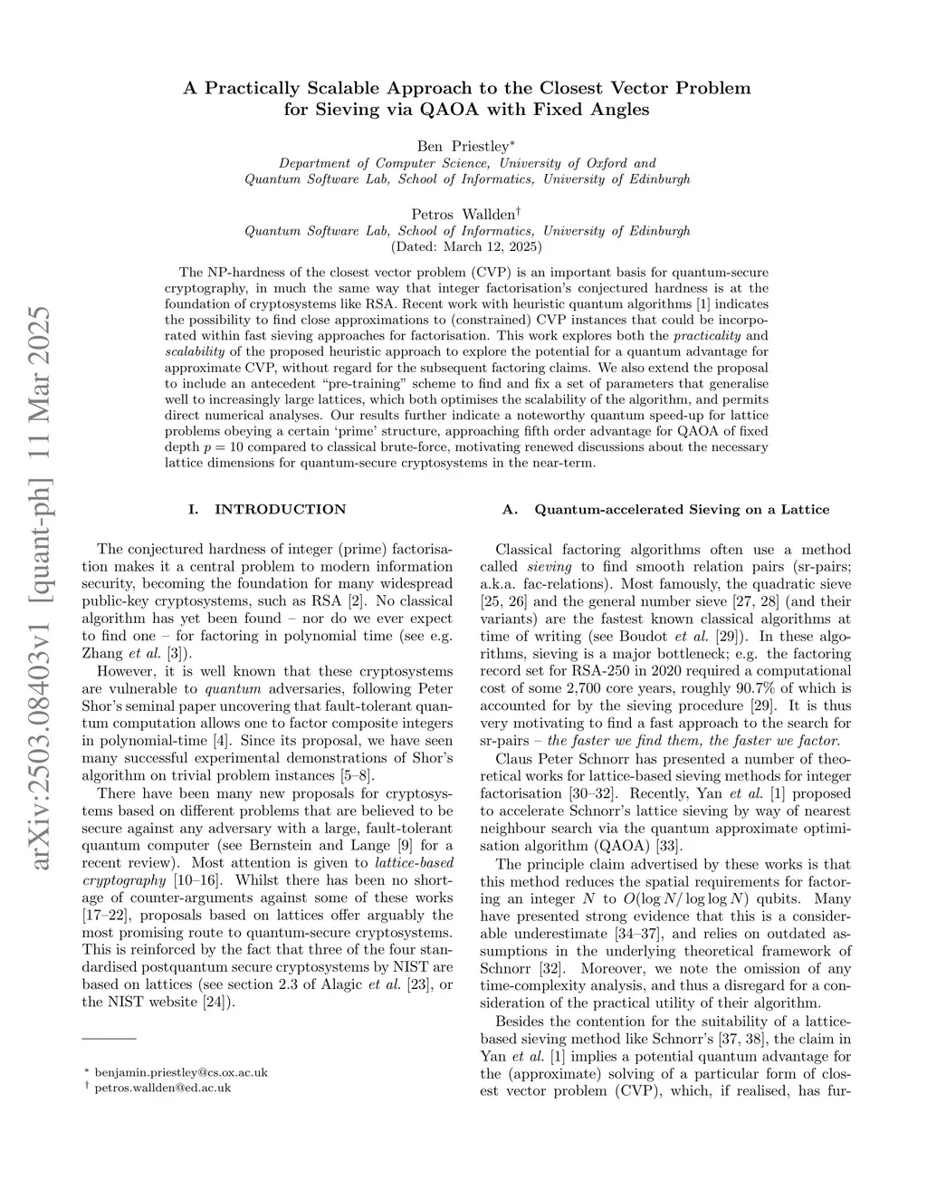 The NP-hardness of the closest vector problem (CVP) is an important basis for quantum-secure cryptography, in much the same way that integer factorisation's conjectured hardness is at the foundation of cryptosystems like RSA. Recent work with heuristic quantum algorithms (arXiv:2212.12372) indicates the possibility to find close approximations to (constrained) CVP instances that could be incorporated within fast sieving approaches for factorisation. This work explores both the practicality and scalability of the proposed heuristic approach to explore the potential for a quantum advantage for approximate CVP, without regard for the subsequent factoring claims. We also extend the proposal to include an antecedent "pre-training" scheme to find and fix a set of parameters that generalise well to increasingly large lattices, which both optimises the scalability of the algorithm, and permits direct numerical analyses. Our results further indicate a noteworthy quantum speed-up for lattice problems obeying a certain `prime' structure, approaching fifth order advantage for QAOA of fixed depth p=10 compared to classical brute-force, motivating renewed discussions about the necessary lattice dimensions for quantum-secure cryptosystems in the near-term.