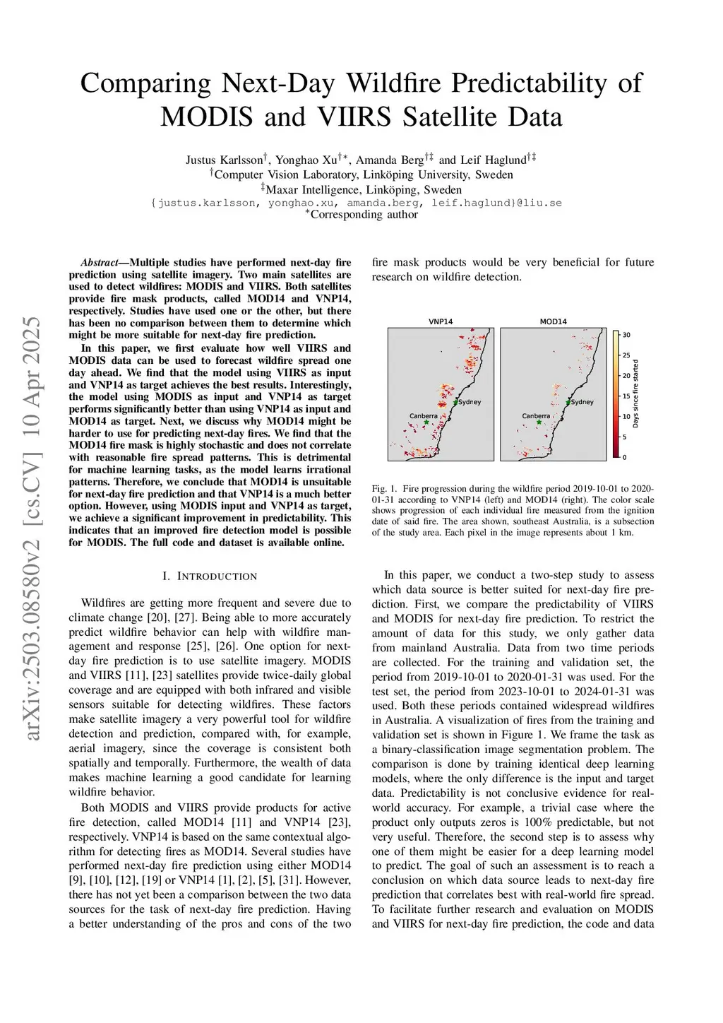 Multiple studies have performed next-day fire prediction using satellite imagery. Two main satellites are used to detect wildfires: MODIS and VIIRS. Both satellites provide fire mask products, called MOD14 and VNP14, respectively. Studies have used one or the other, but there has been no comparison between them to determine which might be more suitable for next-day fire prediction. In this paper, we first evaluate how well VIIRS and MODIS data can be used to forecast wildfire spread one day ahead. We find that the model using VIIRS as input and VNP14 as target achieves the best results. Interestingly, the model using MODIS as input and VNP14 as target performs significantly better than using VNP14 as input and MOD14 as target. Next, we discuss why MOD14 might be harder to use for predicting next-day fires. We find that the MOD14 fire mask is highly stochastic and does not correlate with reasonable fire spread patterns. This is detrimental for machine learning tasks, as the model learns irrational patterns. Therefore, we conclude that MOD14 is unsuitable for next-day fire prediction and that VNP14 is a much better option. However, using MODIS input and VNP14 as target, we achieve a significant improvement in predictability. This indicates that an improved fire detection model is possible for MODIS. The full code and dataset is available online:this https URL