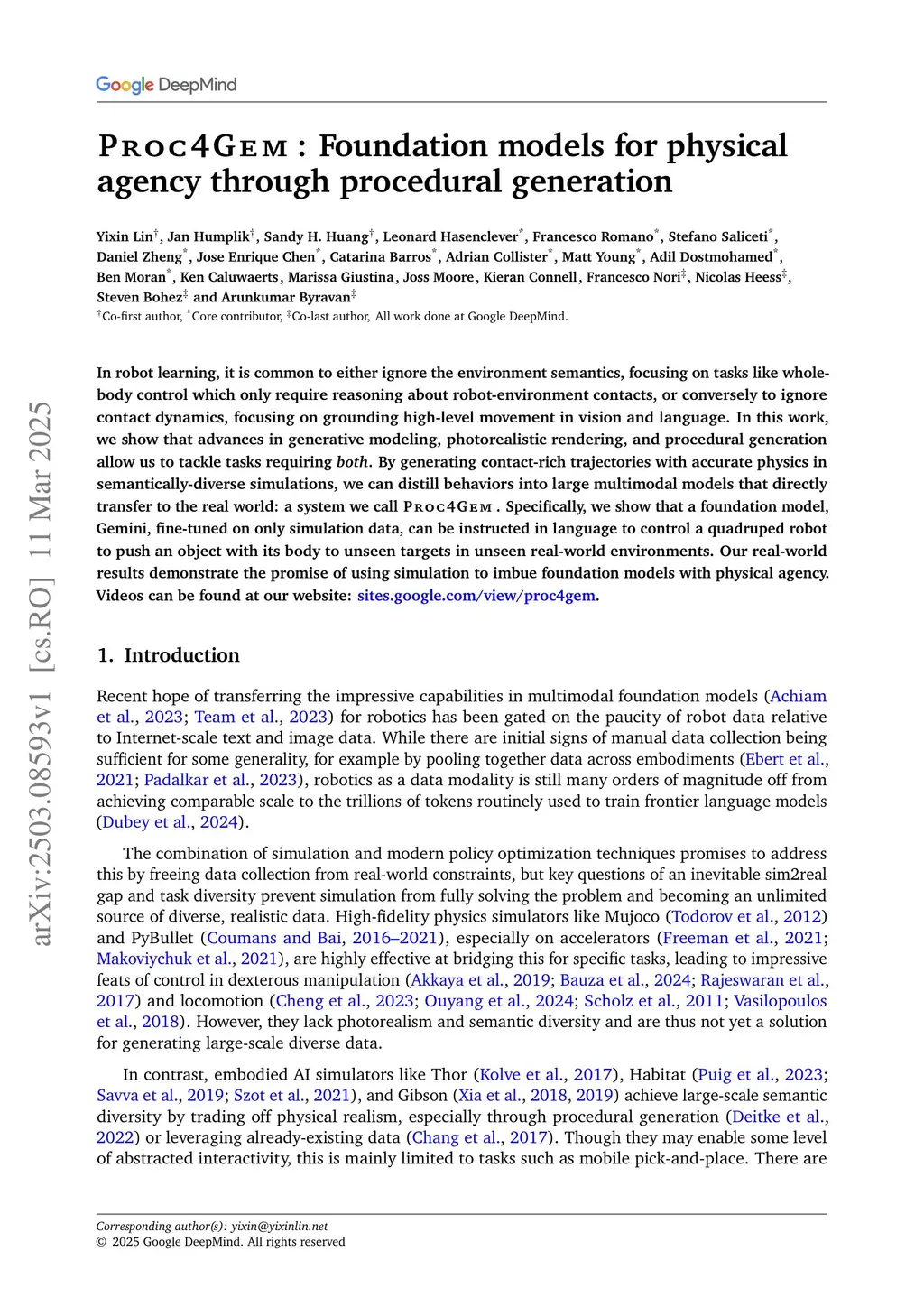 In robot learning, it is common to either ignore the environment semantics, focusing on tasks like whole-body control which only require reasoning about robot-environment contacts, or conversely to ignore contact dynamics, focusing on grounding high-level movement in vision and language. In this work, we show that advances in generative modeling, photorealistic rendering, and procedural generation allow us to tackle tasks requiring both. By generating contact-rich trajectories with accurate physics in semantically-diverse simulations, we can distill behaviors into large multimodal models that directly transfer to the real world: a system we call Proc4Gem. Specifically, we show that a foundation model, Gemini, fine-tuned on only simulation data, can be instructed in language to control a quadruped robot to push an object with its body to unseen targets in unseen real-world environments. Our real-world results demonstrate the promise of using simulation to imbue foundation models with physical agency. Videos can be found at our website:this https URL