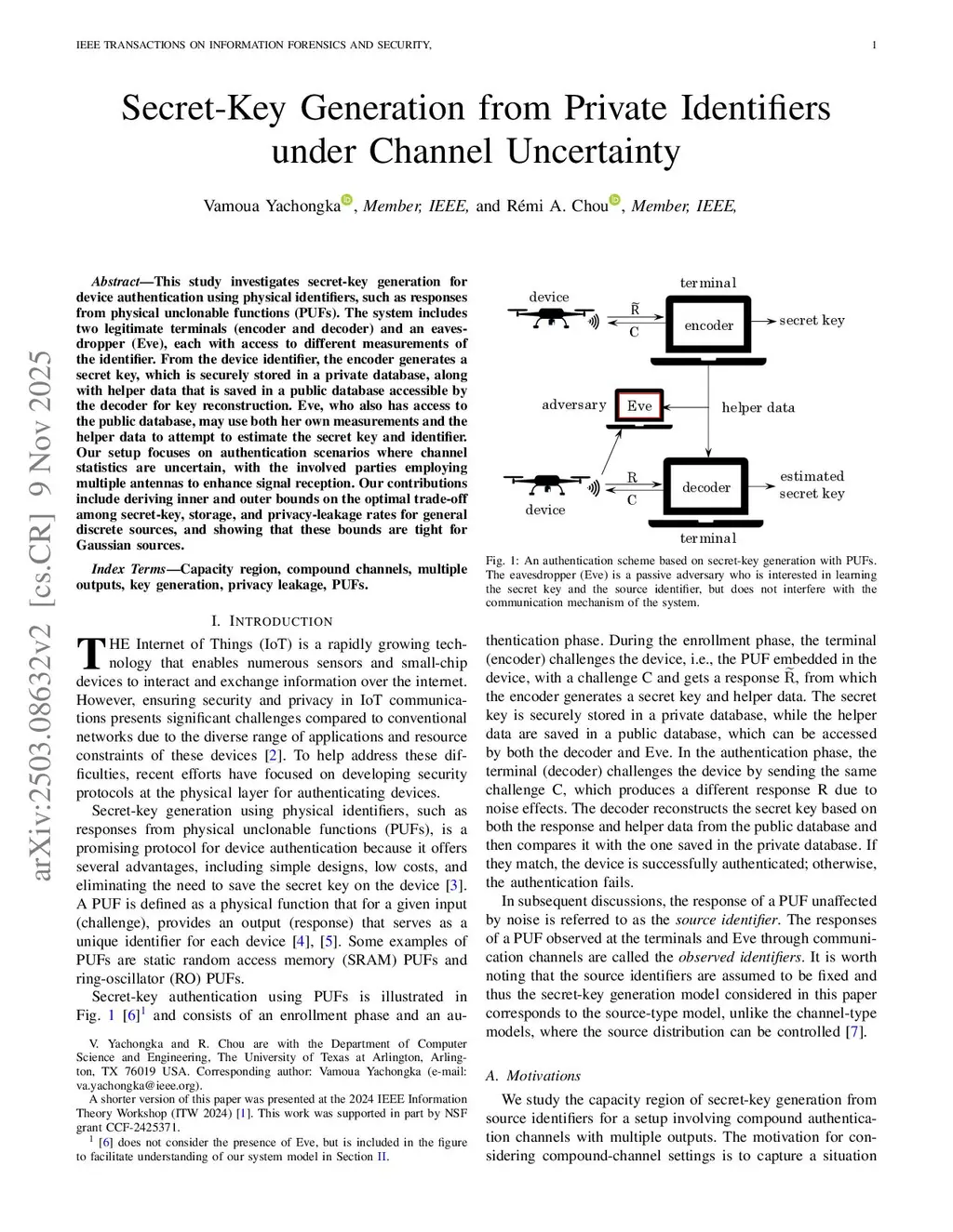 This study investigates secret-key generation for device authentication using physical identifiers, such as responses from physical unclonable functions (PUFs). The system includes two legitimate terminals (encoder and decoder) and an eavesdropper (Eve), each with access to different measurements of the identifier. From the device identifier, the encoder generates a secret key, which is securely stored in a private database, along with helper data that is saved in a public database accessible by the decoder for key reconstruction. Eve, who also has access to the public database, may use both her own measurements and the helper data to attempt to estimate the secret key and identifier. Our setup focuses on authentication scenarios where channel statistics are uncertain, with the involved parties employing multiple antennas to enhance signal reception. Our contributions include deriving inner and outer bounds on the optimal trade-off among secret-key, storage, and privacy-leakage rates for general discrete sources, and showing that these bounds are tight for Gaussian sources.