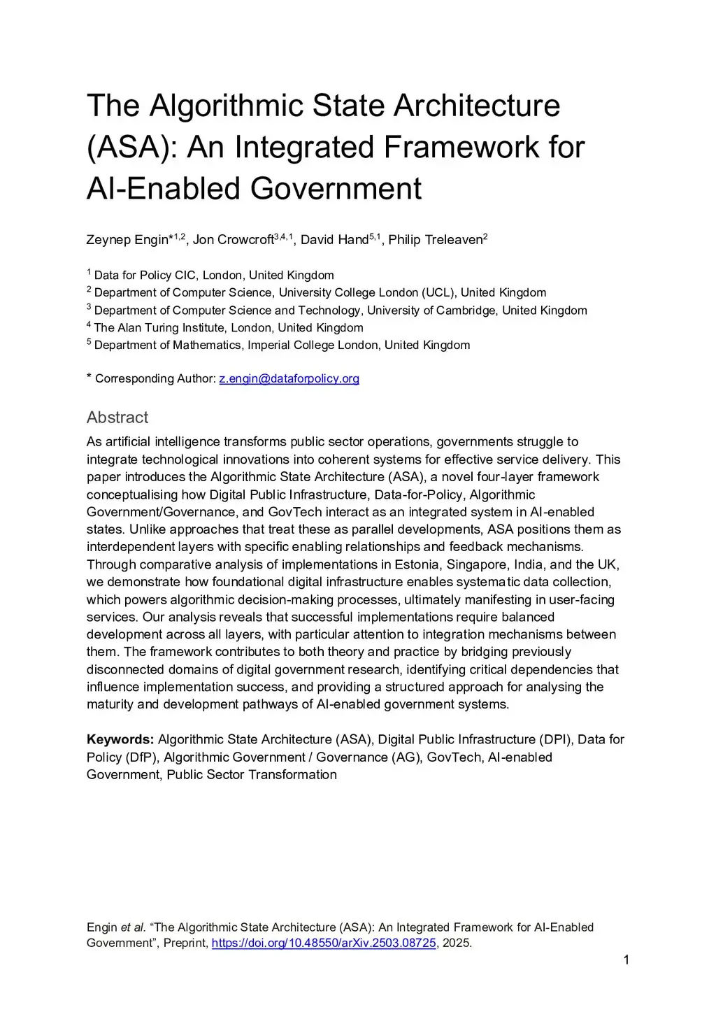The Algorithmic State Architecture (ASA): An Integrated Framework for AI-Enabled Government