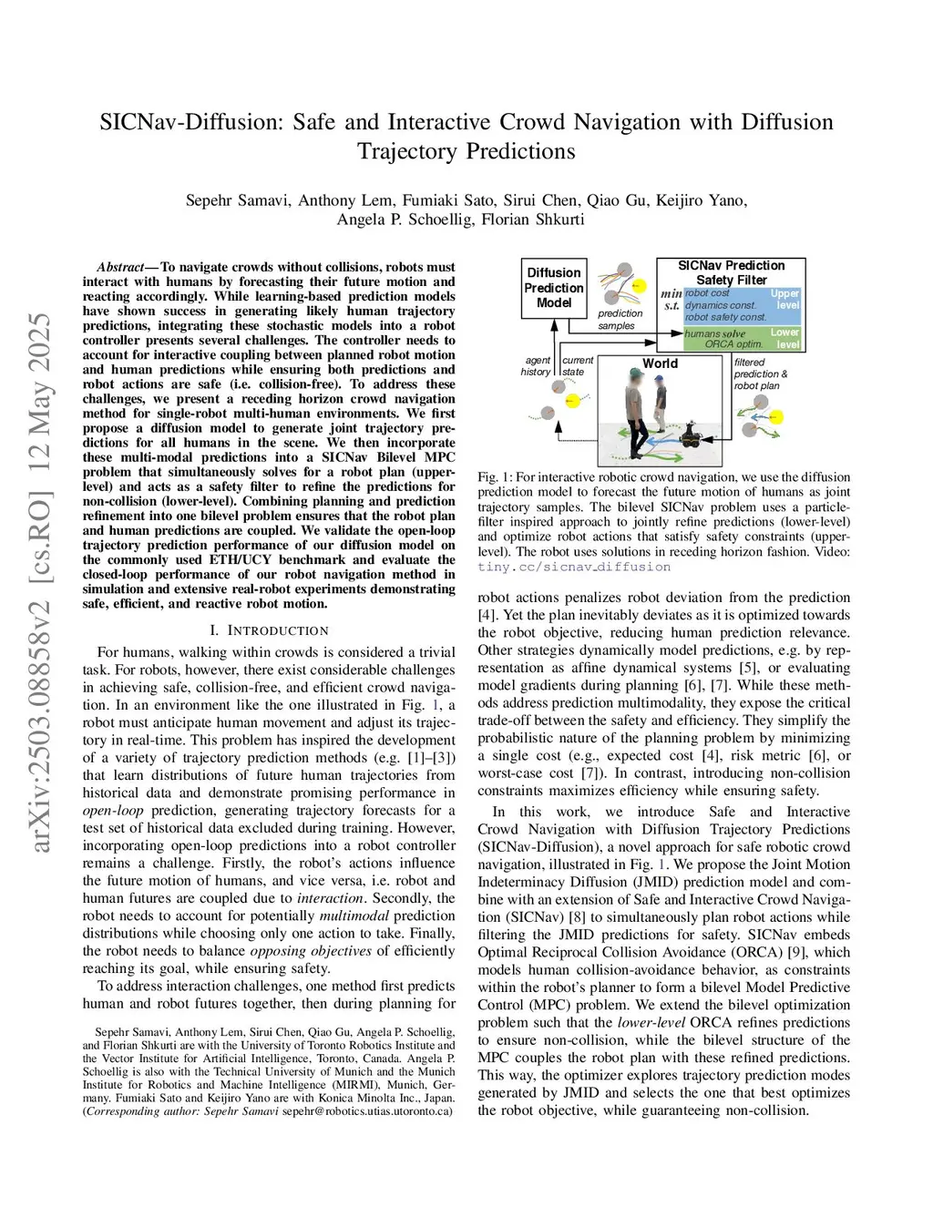 To navigate crowds without collisions, robots must interact with humans by forecasting their future motion and reacting accordingly. While learning-based prediction models have shown success in generating likely human trajectory predictions, integrating these stochastic models into a robot controller presents several challenges. The controller needs to account for interactive coupling between planned robot motion and human predictions while ensuring both predictions and robot actions are safe (i.e. collision-free). To address these challenges, we present a receding horizon crowd navigation method for single-robot multi-human environments. We first propose a diffusion model to generate joint trajectory predictions for all humans in the scene. We then incorporate these multi-modal predictions into a SICNav Bilevel MPC problem that simultaneously solves for a robot plan (upper-level) and acts as a safety filter to refine the predictions for non-collision (lower-level). Combining planning and prediction refinement into one bilevel problem ensures that the robot plan and human predictions are coupled. We validate the open-loop trajectory prediction performance of our diffusion model on the commonly used ETH/UCY benchmark and evaluate the closed-loop performance of our robot navigation method in simulation and extensive real-robot experiments demonstrating safe, efficient, and reactive robot motion.