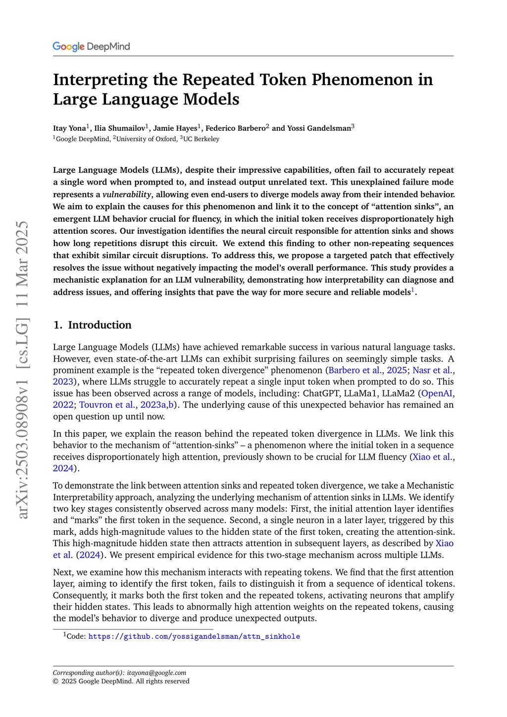 Interpreting the Repeated Token Phenomenon in Large Language Models