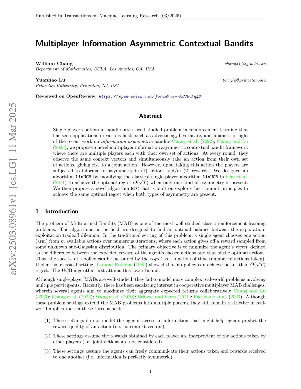 Single-player contextual bandits are a well-studied problem in reinforcement learning that has seen applications in various fields such as advertising, healthcare, and finance. In light of the recent work on \emph{information asymmetric} bandits \cite{chang2022online, chang2023online}, we propose a novel multiplayer information asymmetric contextual bandit framework where there are multiple players each with their own set of actions. At every round, they observe the same context vectors and simultaneously take an action from their own set of actions, giving rise to a joint action. However, upon taking this action the players are subjected to information asymmetry in (1) actions and/or (2) rewards. We designed an algorithm \texttt{LinUCB} by modifying the classical single-player algorithm \texttt{LinUCB} in \cite{chu2011contextual} to achieve the optimal regret when only one kind of asymmetry is present. We then propose a novel algorithm \texttt{ETC} that is built on explore-then-commit principles to achieve the same optimal regret when both types of asymmetry are present.