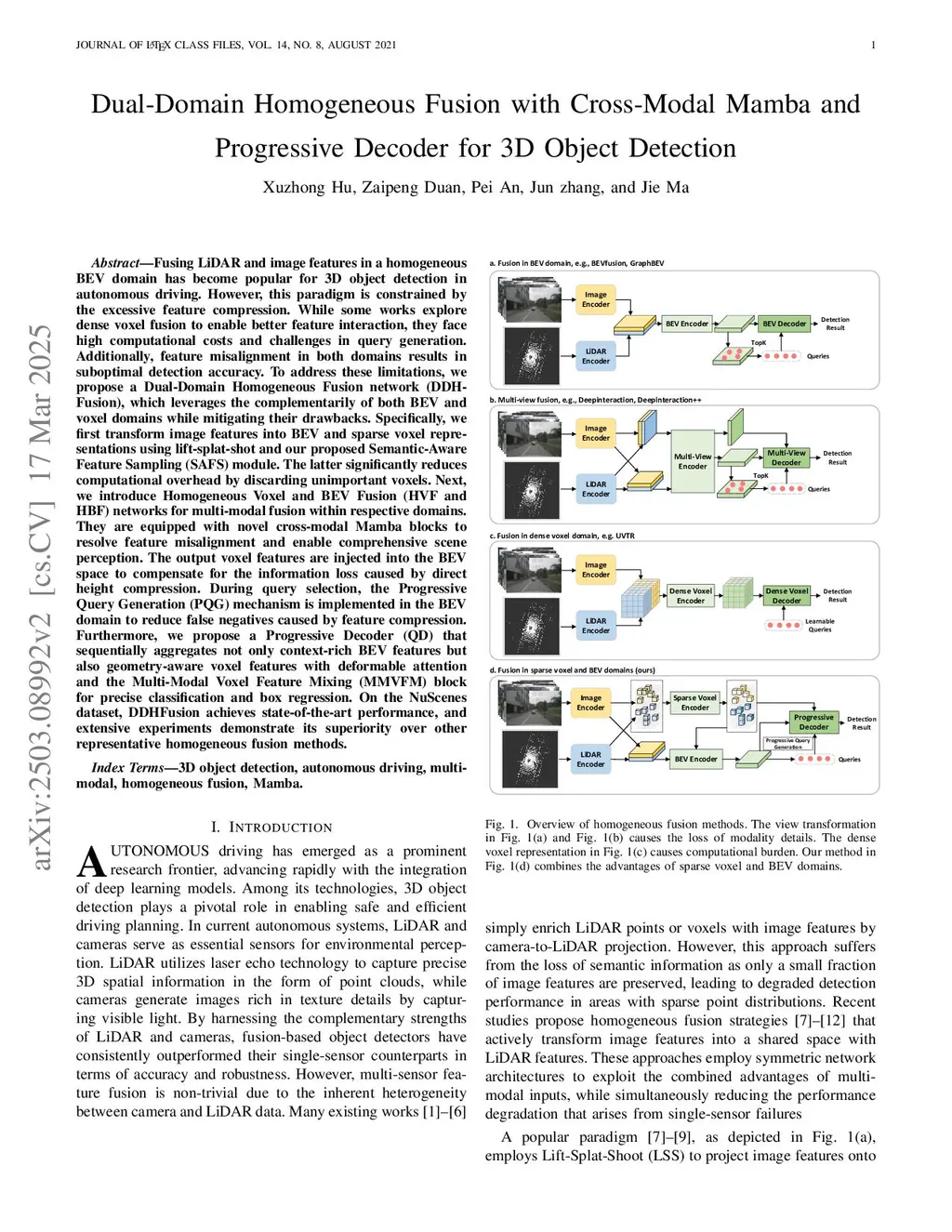 Dual-Domain Homogeneous Fusion with Cross-Modal Mamba and Progressive Decoder for 3D Object Detection