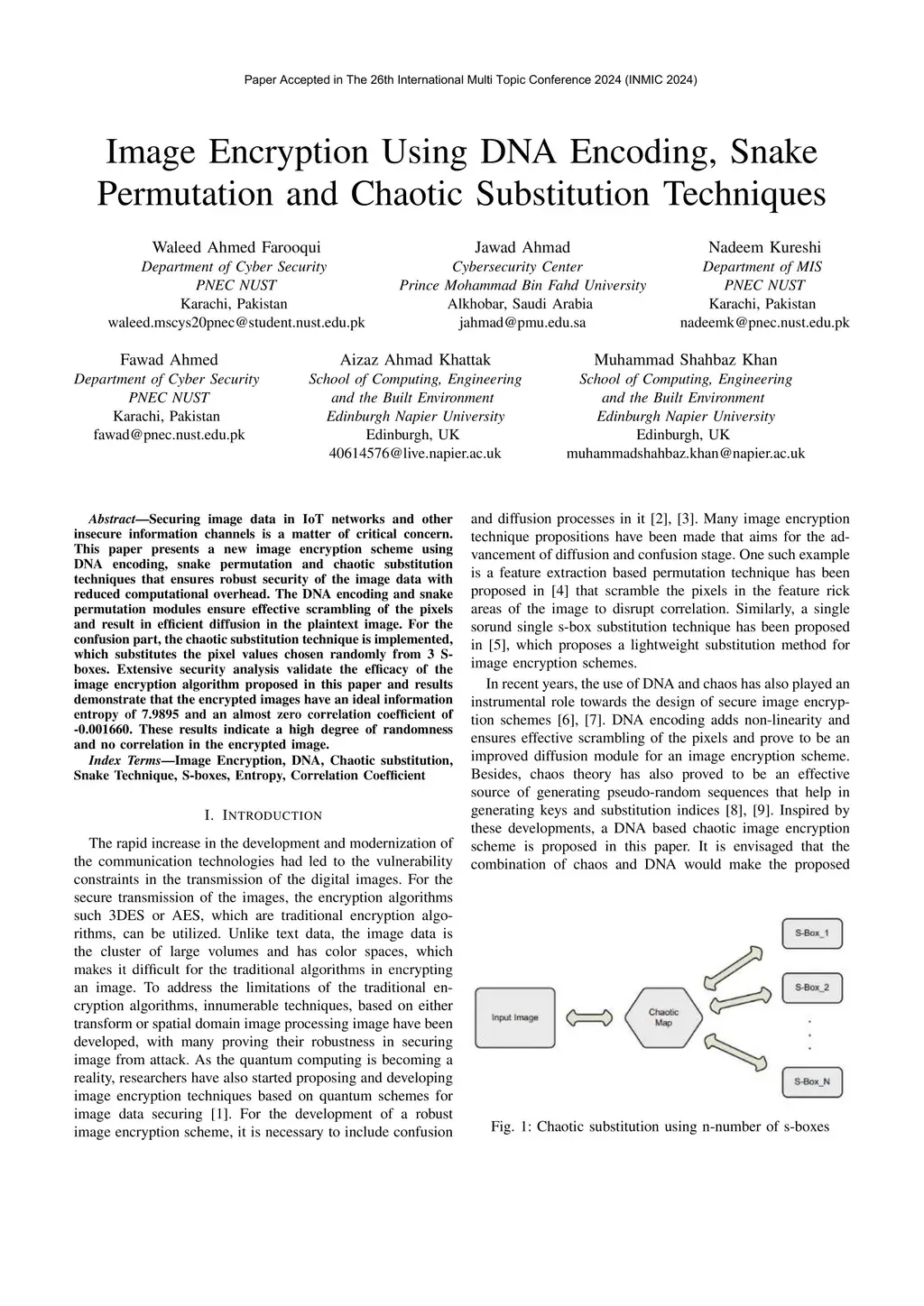 Securing image data in IoT networks and other insecure information channels is a matter of critical concern. This paper presents a new image encryption scheme using DNA encoding, snake permutation and chaotic substitution techniques that ensures robust security of the image data with reduced computational overhead. The DNA encoding and snake permutation modules ensure effective scrambling of the pixels and result in efficient diffusion in the plaintext image. For the confusion part, the chaotic substitution technique is implemented, which substitutes the pixel values chosen randomly from 3 S-boxes. Extensive security analysis validate the efficacy of the image encryption algorithm proposed in this paper and results demonstrate that the encrypted images have an ideal information entropy of 7.9895 and an almost zero correlation coefficient of -0.001660. These results indicate a high degree of randomness and no correlation in the encrypted image.