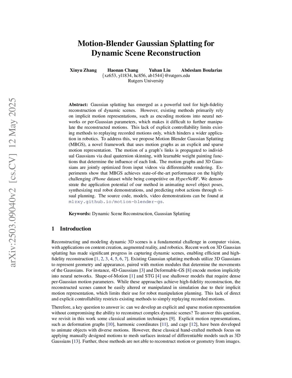 Gaussian splatting has emerged as a powerful tool for high-fidelity reconstruction of dynamic scenes. However, existing methods primarily rely on implicit motion representations, such as encoding motions into neural networks or per-Gaussian parameters, which makes it difficult to further manipulate the reconstructed motions. This lack of explicit controllability limits existing methods to replaying recorded motions only, which hinders a wider application in robotics. To address this, we propose Motion Blender Gaussian Splatting (MBGS), a novel framework that uses motion graphs as an explicit and sparse motion representation. The motion of a graph's links is propagated to individual Gaussians via dual quaternion skinning, with learnable weight painting functions that determine the influence of each link. The motion graphs and 3D Gaussians are jointly optimized from input videos via differentiable rendering. Experiments show that MBGS achieves state-of-the-art performance on the highly challenging iPhone dataset while being competitive on HyperNeRF. We demonstrate the application potential of our method in animating novel object poses, synthesizing real robot demonstrations, and predicting robot actions through visual planning. The source code, models, video demonstrations can be found atthis http URL.