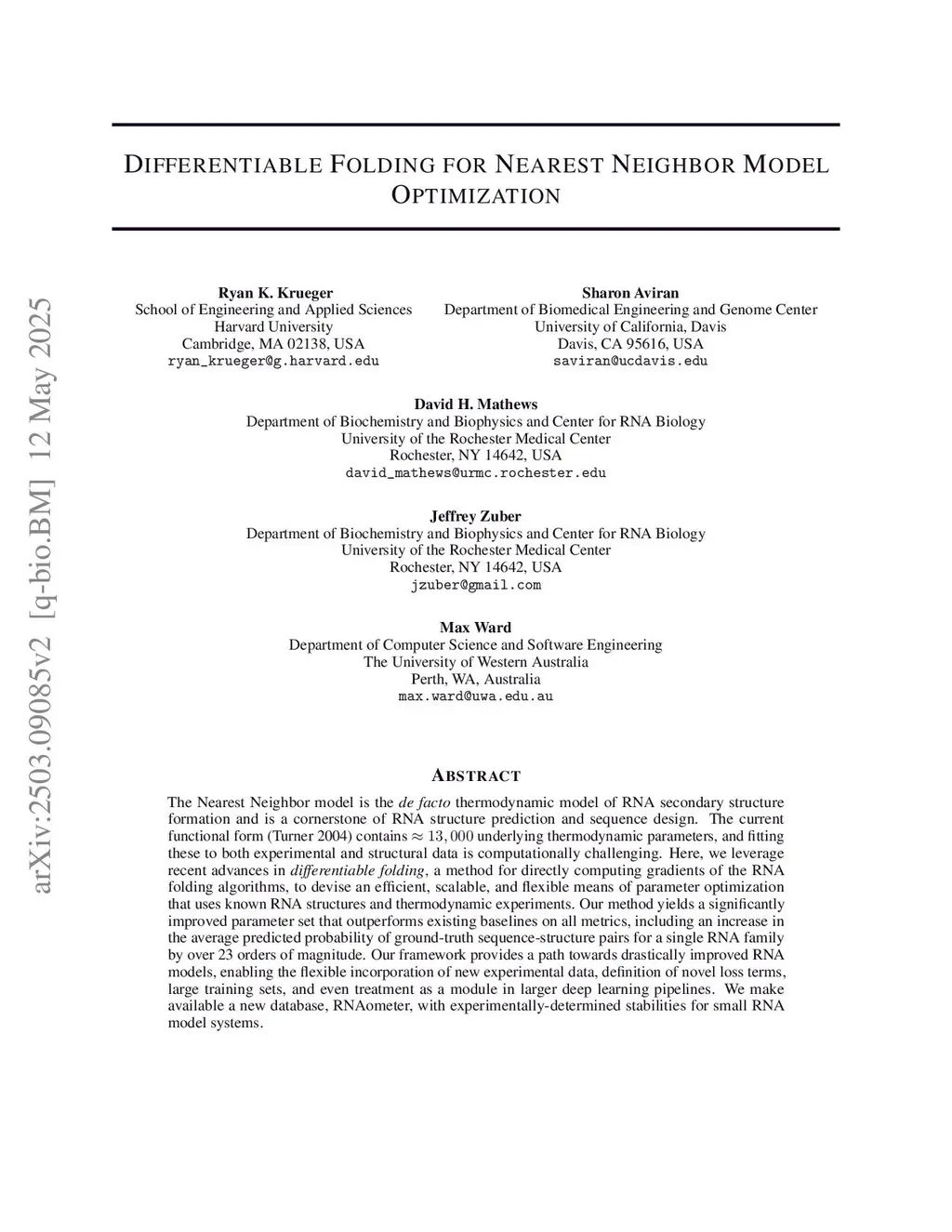 The Nearest Neighbor model is the thermodynamic model of RNA secondary structure formation and is a cornerstone of RNA structure prediction and sequence design. The current functional form (Turner 2004) contains underlying thermodynamic parameters, and fitting these to both experimental and structural data is computationally challenging. Here, we leverage recent advances in , a method for directly computing gradients of the RNA folding algorithms, to devise an efficient, scalable, and flexible means of parameter optimization that uses known RNA structures and thermodynamic experiments. Our method yields a significantly improved parameter set that outperforms existing baselines on all metrics, including an increase in the average predicted probability of ground-truth sequence-structure pairs for a single RNA family by over 23 orders of magnitude. Our framework provides a path towards drastically improved RNA models, enabling the flexible incorporation of new experimental data, definition of novel loss terms, large training sets, and even treatment as a module in larger deep learning pipelines. We make available a new database, RNAometer, with experimentally-determined stabilities for small RNA model systems.