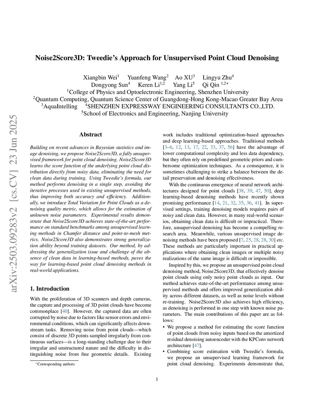 Building on recent advances in Bayesian statistics and image denoising, we propose Noise2Score3D, a fully unsupervised framework for point cloud denoising. Noise2Score3D learns the score function of the underlying point cloud distribution directly from noisy data, eliminating the need for clean data during training. Using Tweedie's formula, our method performs denoising in a single step, avoiding the iterative processes used in existing unsupervised methods, thus improving both accuracy and efficiency. Additionally, we introduce Total Variation for Point Clouds as a denoising quality metric, which allows for the estimation of unknown noise parameters. Experimental results demonstrate that Noise2Score3D achieves state-of-the-art performance on standard benchmarks among unsupervised learning methods in Chamfer distance and point-to-mesh metrics. Noise2Score3D also demonstrates strong generalization ability beyond training datasets. Our method, by addressing the generalization issue and challenge of the absence of clean data in learning-based methods, paves the way for learning-based point cloud denoising methods in real-world applications.