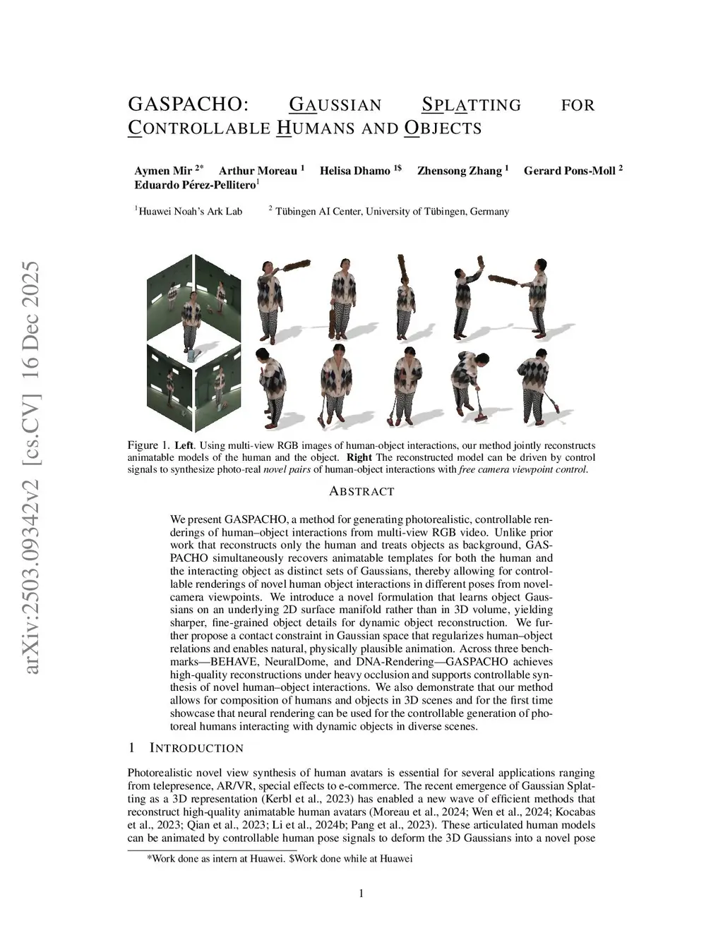 We present GASPACHO: a method for generating photorealistic controllable renderings of human-object interactions. Given a set of multi-view RGB images of human-object interactions, our method reconstructs animatable templates of the human and object as separate sets of Gaussians simultaneously. Different from existing work, which focuses on human reconstruction and ignores objects as background, our method explicitly reconstructs both humans and objects, thereby allowing for controllable renderings of novel human object interactions in different poses from novel-camera viewpoints. During reconstruction, we constrain the Gaussians that generate rendered images to be a linear function of a set of canonical Gaussians. By simply changing the parameters of the linear deformation functions after training, our method can generate renderings of novel human-object interaction in novel poses from novel camera viewpoints. We learn the 3D Gaussian properties of the canonical Gaussians on the underlying 2D manifold of the canonical human and object templates. This in turns requires a canonical object template with a fixed UV unwrapping. To define such an object template, we use a feature based representation to track the object across the multi-view sequence. We further propose an occlusion aware photometric loss that allows for reconstructions under significant occlusions. Several experiments on two human-object datasets - BEHAVE and DNA-Rendering - demonstrate that our method allows for high-quality reconstruction of human and object templates under significant occlusion and the synthesis of controllable renderings of novel human-object interactions in novel human poses from novel camera views.