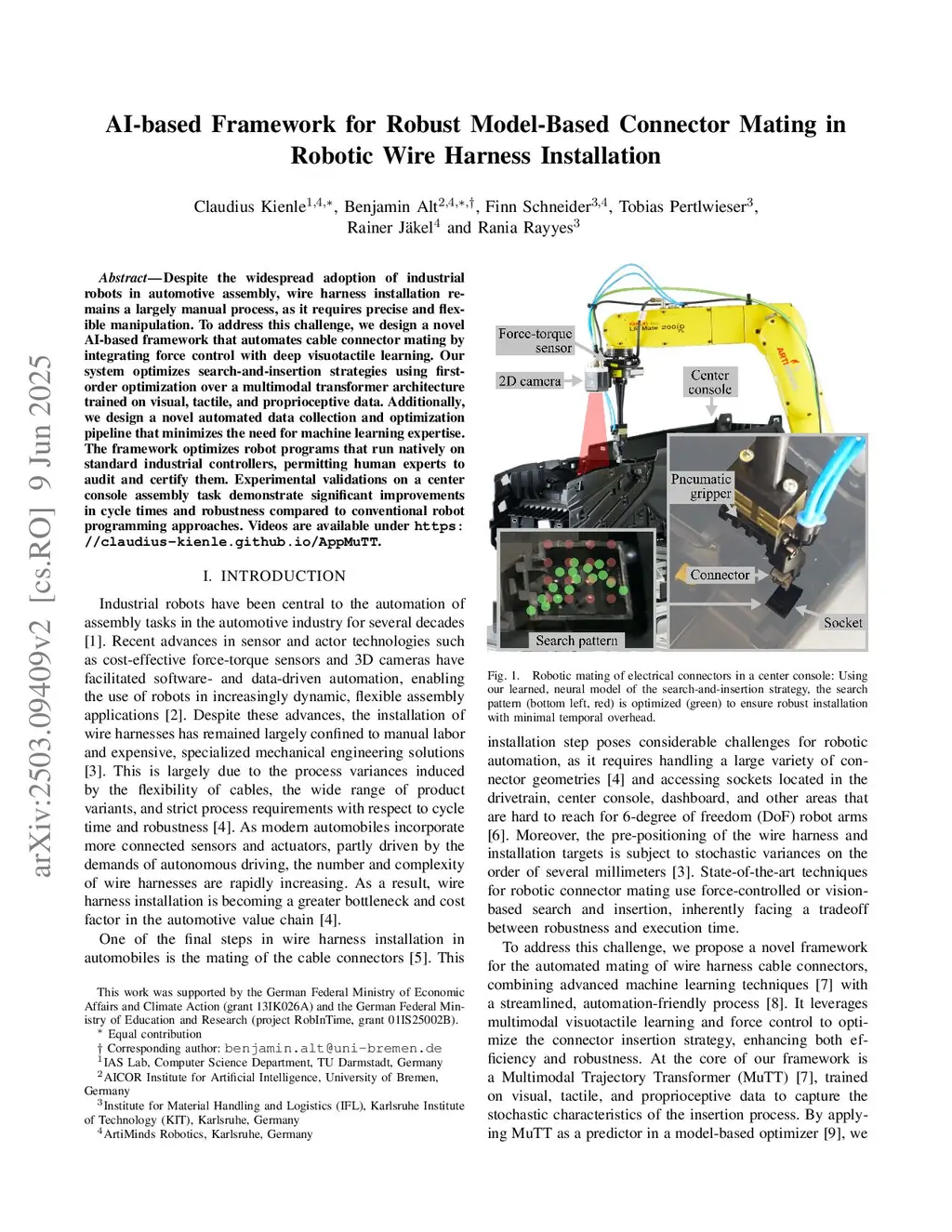 Despite the widespread adoption of industrial robots in automotive assembly, wire harness installation remains a largely manual process, as it requires precise and flexible manipulation. To address this challenge, we design a novel AI-based framework that automates cable connector mating by integrating force control with deep visuotactile learning. Our system optimizes search-and-insertion strategies using first-order optimization over a multimodal transformer architecture trained on visual, tactile, and proprioceptive data. Additionally, we design a novel automated data collection and optimization pipeline that minimizes the need for machine learning expertise. The framework optimizes robot programs that run natively on standard industrial controllers, permitting human experts to audit and certify them. Experimental validations on a center console assembly task demonstrate significant improvements in cycle times and robustness compared to conventional robot programming approaches. Videos are available underthis https URL.