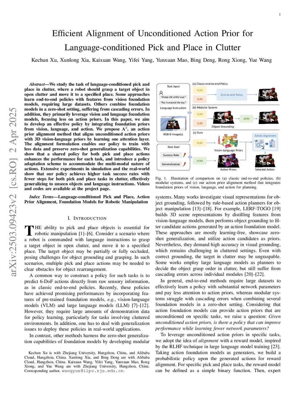 We study the task of language-conditioned pick and place in clutter, where a robot should grasp a target object in open clutter and move it to a specified place. Some approaches learn end-to-end policies with features from vision foundation models, requiring large datasets. Others combine foundation models in a zero-shot setting, suffering from cascading errors. In addition, they primarily leverage vision and language foundation models, focusing less on action priors. In this paper, we aim to develop an effective policy by integrating foundation priors from vision, language, and action. We propose A, an action prior alignment method that aligns unconditioned action priors with 3D vision-language priors by learning one attention layer. The alignment formulation enables our policy to train with less data and preserve zero-shot generalization capabilities. We show that a shared policy for both pick and place actions enhances the performance for each task, and introduce a policy adaptation scheme to accommodate the multi-modal nature of actions. Extensive experiments in simulation and the real-world show that our policy achieves higher task success rates with fewer steps for both pick and place tasks in clutter, effectively generalizing to unseen objects and language instructions. Videos and codes are available atthis https URL.
