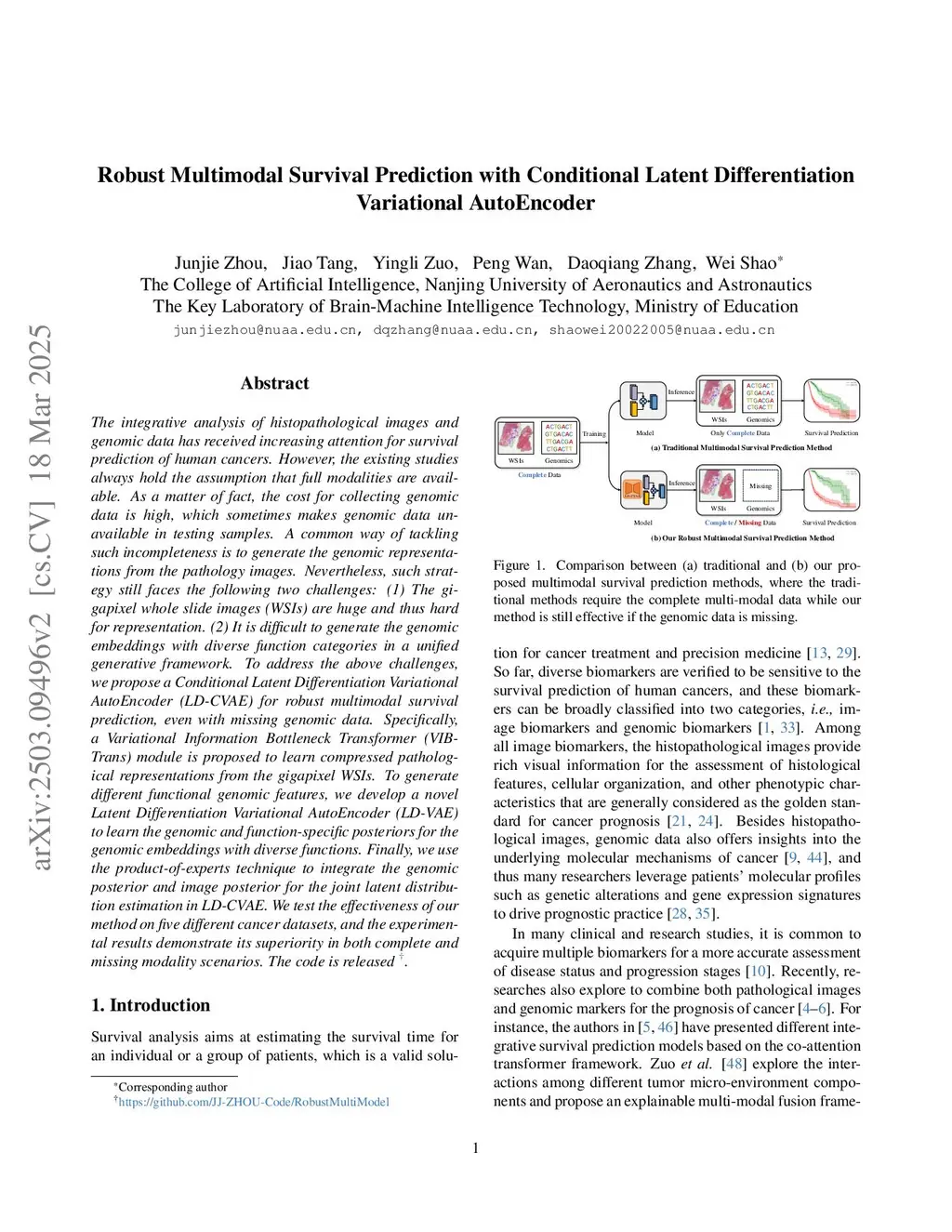 Robust Multimodal Survival Prediction with the Latent Differentiation Conditional Variational AutoEncoder