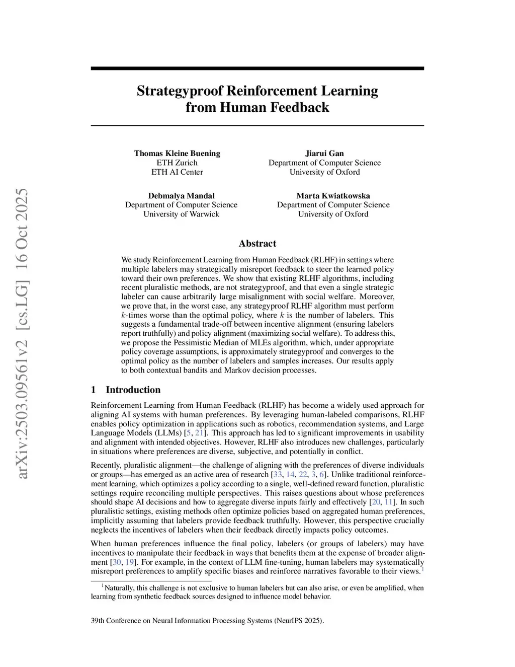 We study Reinforcement Learning from Human Feedback (RLHF) in settings where multiple labelers may strategically misreport feedback to steer the learned policy toward their own preferences. We show that existing RLHF algorithms, including recent pluralistic methods, are not strategyproof, and that even a single strategic labeler can cause arbitrarily large misalignment with social welfare. Moreover, we prove that, in the worst case, any strategyproof RLHF algorithm must perform -times worse than the optimal policy, where is the number of labelers. This suggests a fundamental trade-off between incentive alignment (ensuring labelers report truthfully) and policy alignment (maximizing social welfare). To address this, we propose the Pessimistic Median of MLEs algorithm, which, under appropriate policy coverage assumptions, is approximately strategyproof and converges to the optimal policy as the number of labelers and samples increases. Our results apply to both contextual bandits and Markov decision processes.