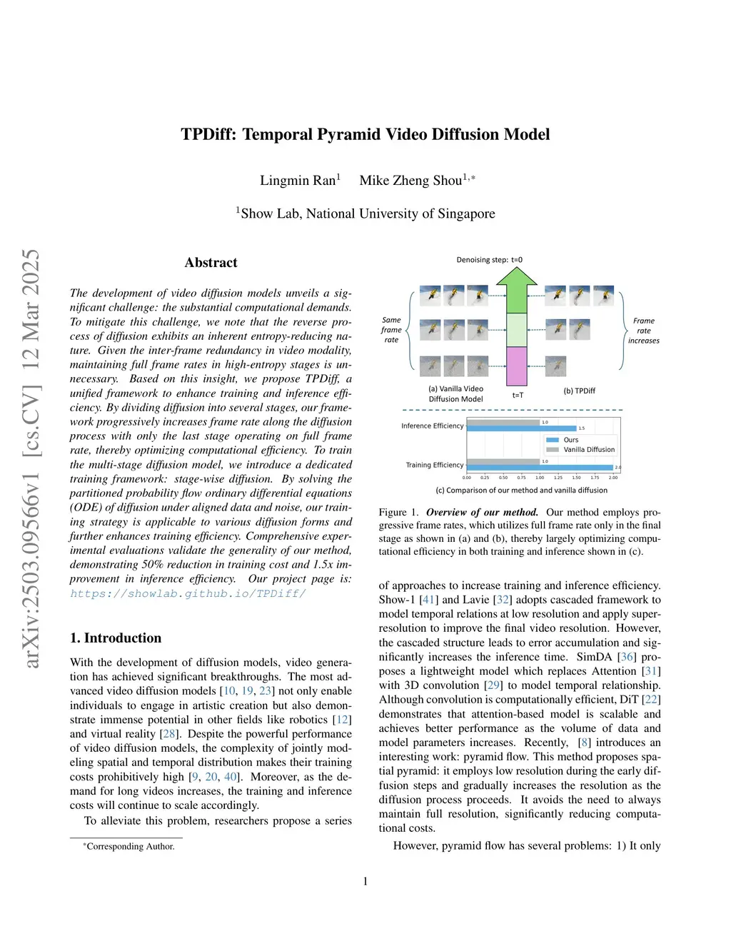The development of video diffusion models unveils a significant challenge: the substantial computational demands. To mitigate this challenge, we note that the reverse process of diffusion exhibits an inherent entropy-reducing nature. Given the inter-frame redundancy in video modality, maintaining full frame rates in high-entropy stages is unnecessary. Based on this insight, we propose TPDiff, a unified framework to enhance training and inference efficiency. By dividing diffusion into several stages, our framework progressively increases frame rate along the diffusion process with only the last stage operating on full frame rate, thereby optimizing computational efficiency. To train the multi-stage diffusion model, we introduce a dedicated training framework: stage-wise diffusion. By solving the partitioned probability flow ordinary differential equations (ODE) of diffusion under aligned data and noise, our training strategy is applicable to various diffusion forms and further enhances training efficiency. Comprehensive experimental evaluations validate the generality of our method, demonstrating 50% reduction in training cost and 1.5x improvement in inference efficiency.