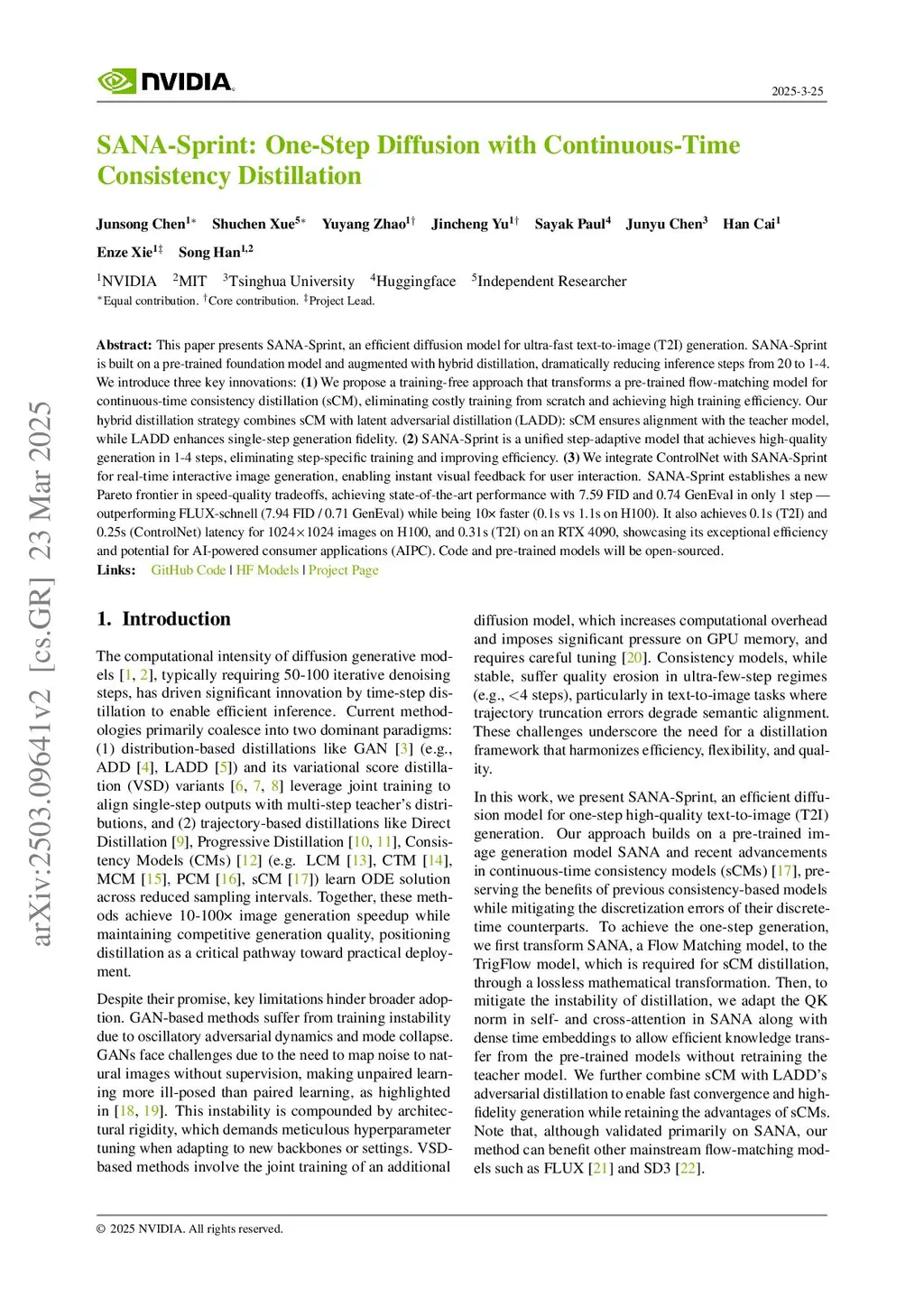 This paper presents SANA-Sprint, an efficient diffusion model for ultra-fast text-to-image (T2I) generation. SANA-Sprint is built on a pre-trained foundation model and augmented with hybrid distillation, dramatically reducing inference steps from 20 to 1-4. We introduce three key innovations: (1) We propose a training-free approach that transforms a pre-trained flow-matching model for continuous-time consistency distillation (sCM), eliminating costly training from scratch and achieving high training efficiency. Our hybrid distillation strategy combines sCM with latent adversarial distillation (LADD): sCM ensures alignment with the teacher model, while LADD enhances single-step generation fidelity. (2) SANA-Sprint is a unified step-adaptive model that achieves high-quality generation in 1-4 steps, eliminating step-specific training and improving efficiency. (3) We integrate ControlNet with SANA-Sprint for real-time interactive image generation, enabling instant visual feedback for user interaction. SANA-Sprint establishes a new Pareto frontier in speed-quality tradeoffs, achieving state-of-the-art performance with 7.59 FID and 0.74 GenEval in only 1 step - outperforming FLUX-schnell (7.94 FID / 0.71 GenEval) while being 10x faster (0.1s vs 1.1s on H100). It also achieves 0.1s (T2I) and 0.25s (ControlNet) latency for 1024 x 1024 images on H100, and 0.31s (T2I) on an RTX 4090, showcasing its exceptional efficiency and potential for AI-powered consumer applications (AIPC). Code and pre-trained models will be open-sourced.