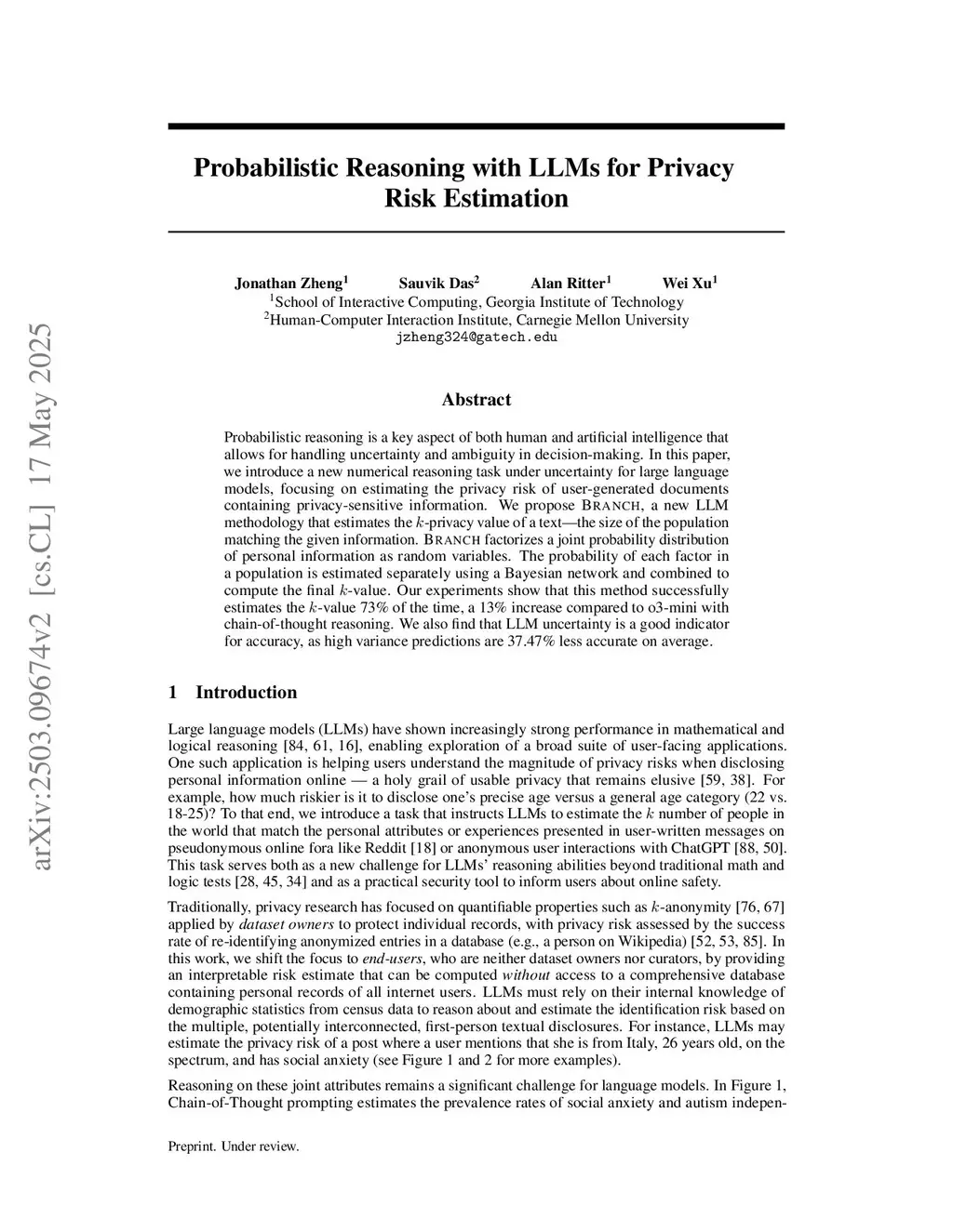 Probabilistic reasoning is a key aspect of both human and artificial intelligence that allows for handling uncertainty and ambiguity in decision-making. In this paper, we introduce a new numerical reasoning task under uncertainty for large language models, focusing on estimating the privacy risk of user-generated documents containing privacy-sensitive information. We propose BRANCH, a new LLM methodology that estimates the k-privacy value of a text-the size of the population matching the given information. BRANCH factorizes a joint probability distribution of personal information as random variables. The probability of each factor in a population is estimated separately using a Bayesian network and combined to compute the final k-value. Our experiments show that this method successfully estimates the k-value 73% of the time, a 13% increase compared to o3-mini with chain-of-thought reasoning. We also find that LLM uncertainty is a good indicator for accuracy, as high-variance predictions are 37.47% less accurate on average.