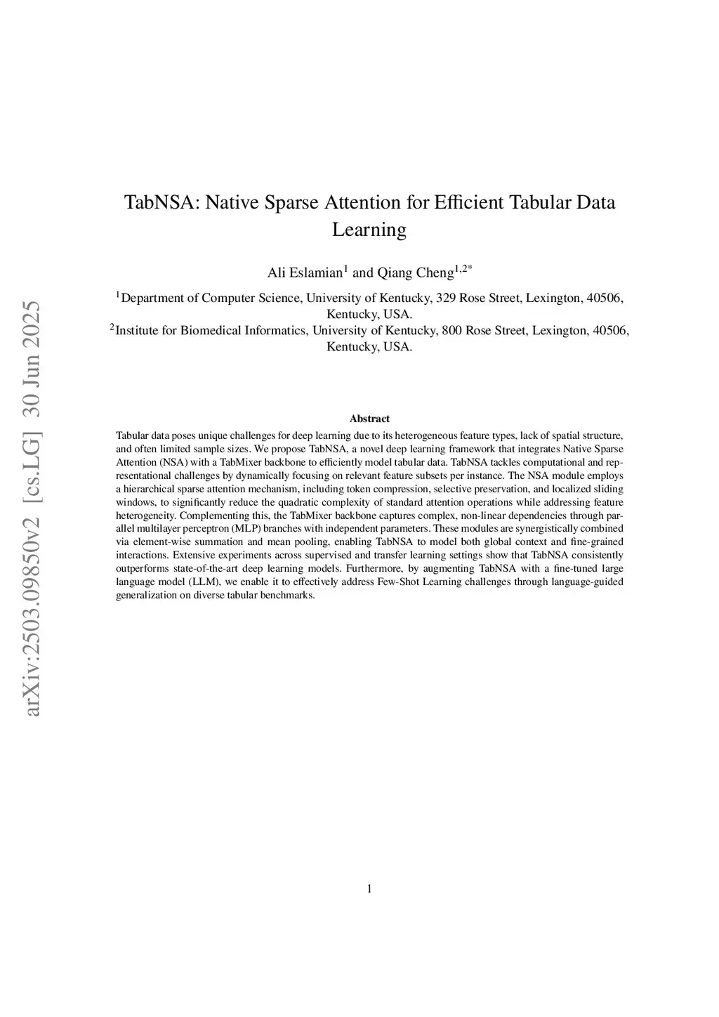Tabular data poses unique challenges for deep learning due to its heterogeneous feature types, lack of spatial structure, and often limited sample sizes. We propose TabNSA, a novel deep learning framework that integrates Native Sparse Attention (NSA) with a TabMixer backbone to efficiently model tabular data. TabNSA tackles computational and representational challenges by dynamically focusing on relevant feature subsets per instance. The NSA module employs a hierarchical sparse attention mechanism, including token compression, selective preservation, and localized sliding windows, to significantly reduce the quadratic complexity of standard attention operations while addressing feature heterogeneity. Complementing this, the TabMixer backbone captures complex, non-linear dependencies through parallel multilayer perceptron (MLP) branches with independent parameters. These modules are synergistically combined via element-wise summation and mean pooling, enabling TabNSA to model both global context and fine-grained interactions. Extensive experiments across supervised and transfer learning settings show that TabNSA consistently outperforms state-of-the-art deep learning models. Furthermore, by augmenting TabNSA with a fine-tuned large language model (LLM), we enable it to effectively address Few-Shot Learning challenges through language-guided generalization on diverse tabular benchmarks.Code available on:this https URL