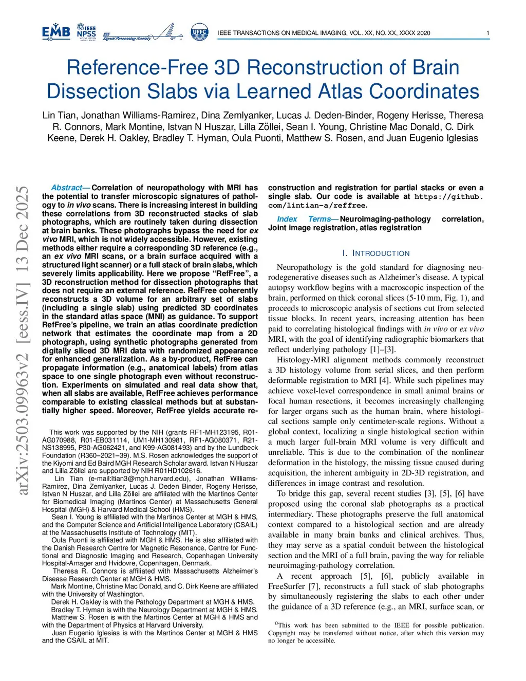 Correlation of neuropathology with MRI has the potential to transfer microscopic signatures of pathology to in vivo scans. There is increasing interest in building these correlations from 3D reconstructed stacks of slab photographs, which are routinely taken during dissection at brain banks. These photographs bypass the need for ex vivo MRI, which is not widely accessible. However, existing methods either require a corresponding 3D reference (e.g., an ex vivo MRI scans, or a brain surface acquired with a structured light scanner) or a full stack of brain slabs, which severely limits applicability. Here we propose RefFree, a 3D reconstruction method for dissection photographs that does not require an external reference. RefFree coherently reconstructs a 3D volume for an arbitrary set of slabs (including a single slab) using predicted 3D coordinates in the standard atlas space (MNI) as guidance. To support RefFree's pipeline, we train an atlas coordinate prediction network that estimates the coordinate map from a 2D photograph, using synthetic photographs generated from digitally sliced 3D MRI data with randomized appearance for enhanced generalization. As a by-product, RefFree can propagate information (e.g., anatomical labels) from atlas space to one single photograph even without reconstruction. Experiments on simulated and real data show that, when all slabs are available, RefFree achieves performance comparable to existing classical methods but at substantially higher speed. Moreover, RefFree yields accurate reconstruction and registration for partial stacks or even a single slab. Our code is available atthis https URL.