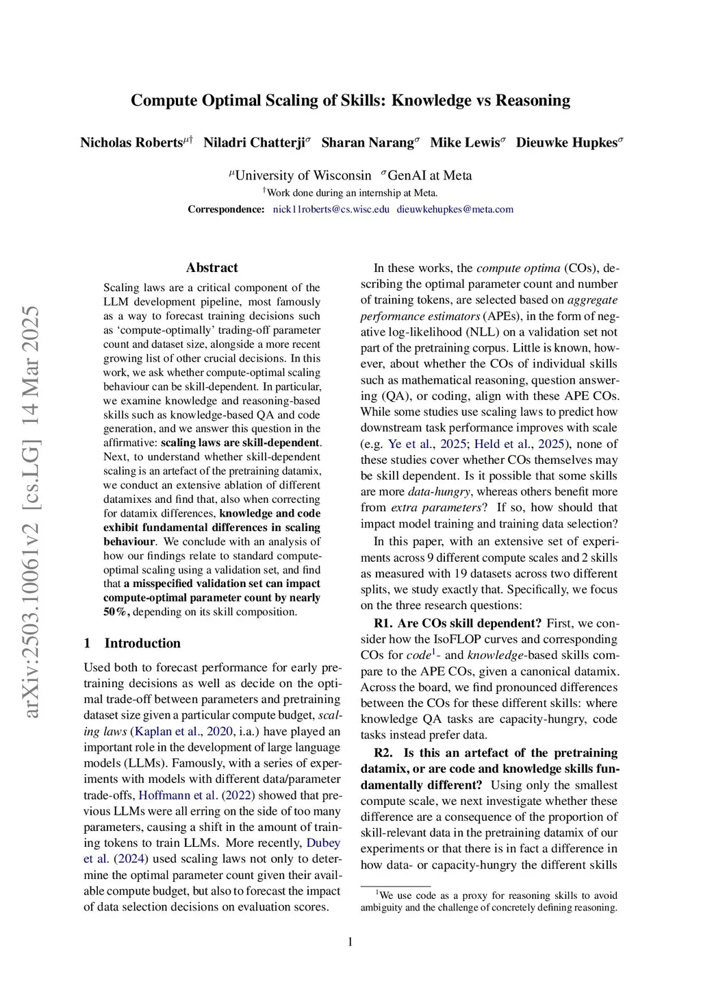 Compute Optimal Scaling of Skills: Knowledge vs Reasoning