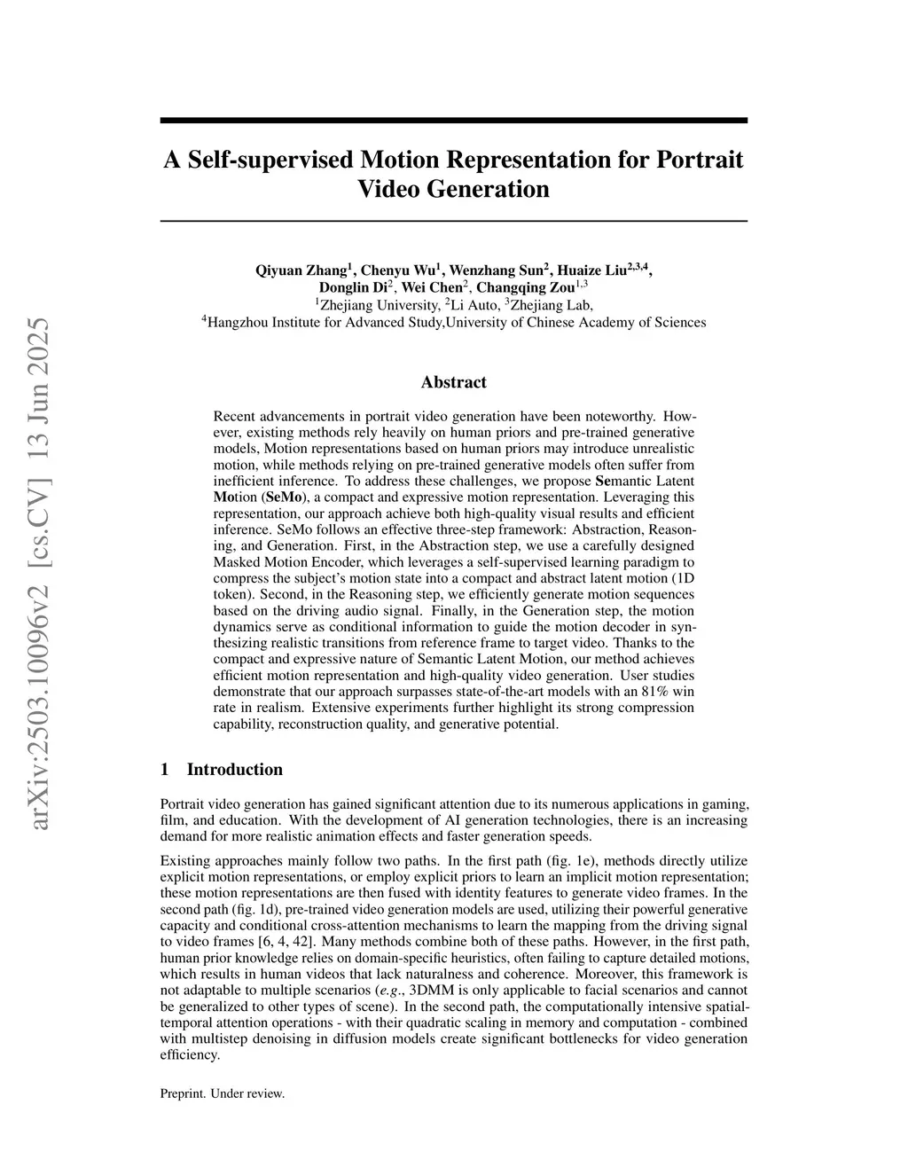 Recent advancements in portrait video generation have been noteworthy. However, existing methods rely heavily on human priors and pre-trained generative models, Motion representations based on human priors may introduce unrealistic motion, while methods relying on pre-trained generative models often suffer from inefficient inference. To address these challenges, we propose Semantic Latent Motion (SeMo), a compact and expressive motion representation. Leveraging this representation, our approach achieve both high-quality visual results and efficient inference. SeMo follows an effective three-step framework: Abstraction, Reasoning, and Generation. First, in the Abstraction step, we use a carefully designed Masked Motion Encoder, which leverages a self-supervised learning paradigm to compress the subject's motion state into a compact and abstract latent motion (1D token). Second, in the Reasoning step, we efficiently generate motion sequences based on the driving audio signal. Finally, in the Generation step, the motion dynamics serve as conditional information to guide the motion decoder in synthesizing realistic transitions from reference frame to target video. Thanks to the compact and expressive nature of Semantic Latent Motion, our method achieves efficient motion representation and high-quality video generation. User studies demonstrate that our approach surpasses state-of-the-art models with an 81% win rate in realism. Extensive experiments further highlight its strong compression capability, reconstruction quality, and generative potential.