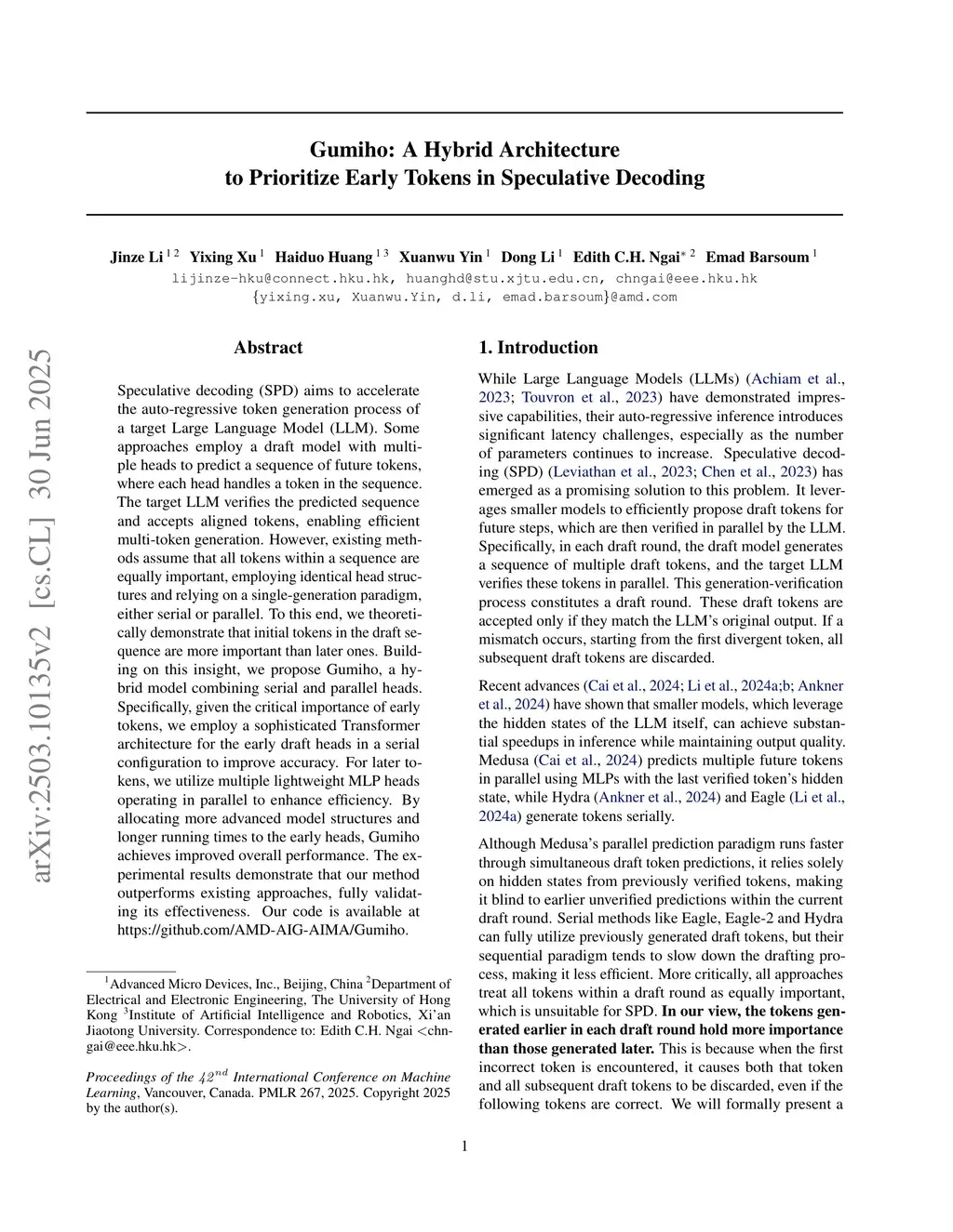 Speculative decoding (SPD) aims to accelerate the auto-regressive token generation process of a target Large Language Model (LLM). Some approaches employ a draft model with multiple heads to predict a sequence of future tokens, where each head handles a token in the sequence. The target LLM verifies the predicted sequence and accepts aligned tokens, enabling efficient multi-token generation. However, existing methods assume that all tokens within a sequence are equally important, employing identical head structures and relying on a single-generation paradigm, either serial or parallel. To this end, we theoretically demonstrate that initial tokens in the draft sequence are more important than later ones. Building on this insight, we propose Gumiho, a hybrid model combining serial and parallel heads. Specifically, given the critical importance of early tokens, we employ a sophisticated Transformer architecture for the early draft heads in a serial configuration to improve accuracy. For later tokens, we utilize multiple lightweight MLP heads operating in parallel to enhance efficiency. By allocating more advanced model structures and longer running times to the early heads, Gumiho achieves improved overall performance. The experimental results demonstrate that our method outperforms existing approaches, fully validating its effectiveness.
