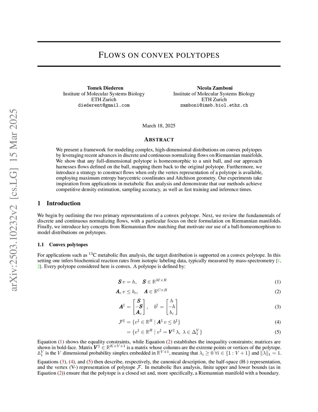 We present a framework for modeling complex, high-dimensional distributions on convex polytopes by leveraging recent advances in discrete and continuous normalizing flows on Riemannian manifolds. We show that any full-dimensional polytope is homeomorphic to a unit ball, and our approach harnesses flows defined on the ball, mapping them back to the original polytope. Furthermore, we introduce a strategy to construct flows when only the vertex representation of a polytope is available, employing maximum entropy barycentric coordinates and Aitchison geometry. Our experiments take inspiration from applications in metabolic flux analysis and demonstrate that our methods achieve competitive density estimation, sampling accuracy, as well as fast training and inference times.