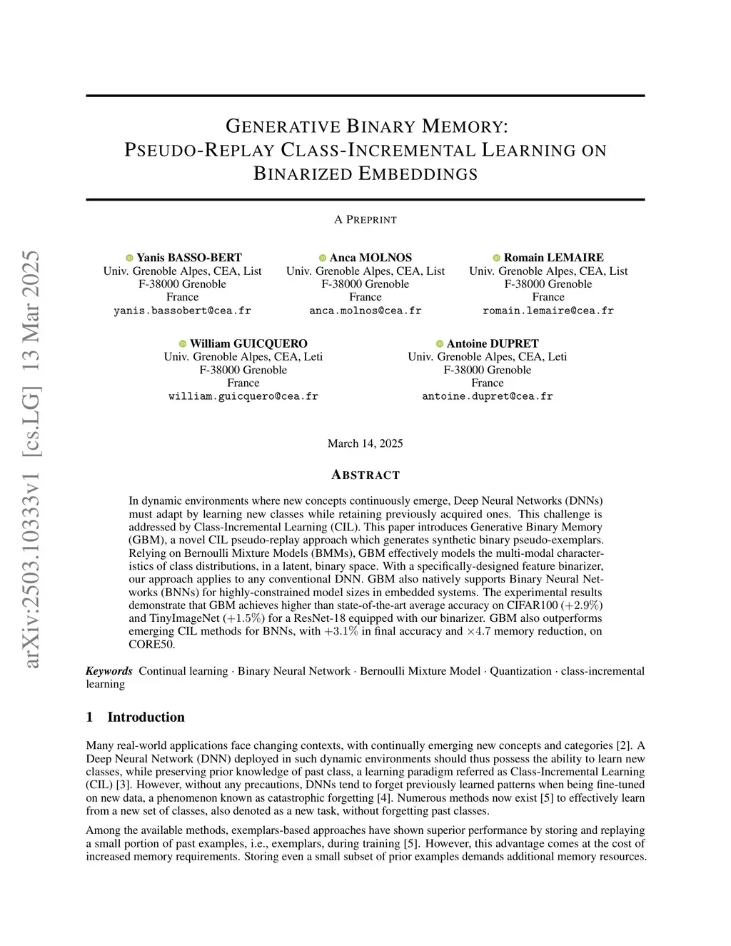 In dynamic environments where new concepts continuously emerge, Deep Neural Networks (DNNs) must adapt by learning new classes while retaining previously acquired ones. This challenge is addressed by Class-Incremental Learning (CIL). This paper introduces Generative Binary Memory (GBM), a novel CIL pseudo-replay approach which generates synthetic binary pseudo-exemplars. Relying on Bernoulli Mixture Models (BMMs), GBM effectively models the multi-modal characteristics of class distributions, in a latent, binary space. With a specifically-designed feature binarizer, our approach applies to any conventional DNN. GBM also natively supports Binary Neural Networks (BNNs) for highly-constrained model sizes in embedded systems. The experimental results demonstrate that GBM achieves higher than state-of-the-art average accuracy on CIFAR100 (+2.9%) and TinyImageNet (+1.5%) for a ResNet-18 equipped with our binarizer. GBM also outperforms emerging CIL methods for BNNs, with +3.1% in final accuracy and x4.7 memory reduction, on CORE50.