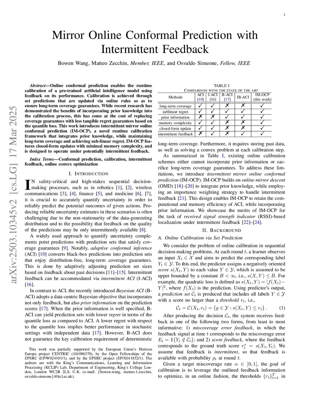 Online conformal prediction enables the runtime calibration of a pre-trained artificial intelligence model using feedback on its performance. Calibration is achieved through set predictions that are updated via online rules so as to ensure long-term coverage guarantees. While recent research has demonstrated the benefits of incorporating prior knowledge into the calibration process, this has come at the cost of replacing coverage guarantees with less tangible regret guarantees based on the quantile loss. This work introduces intermittent mirror online conformal prediction (IM-OCP), a novel runtime calibration framework that integrates prior knowledge, operates under potentially intermittent feedback, and features minimal memory complexity. IM-OCP guarantees long-term coverage and sub-linear regret, both of which hold deterministically for any given data sequence and in expectation with respect to the intermittent feedback.