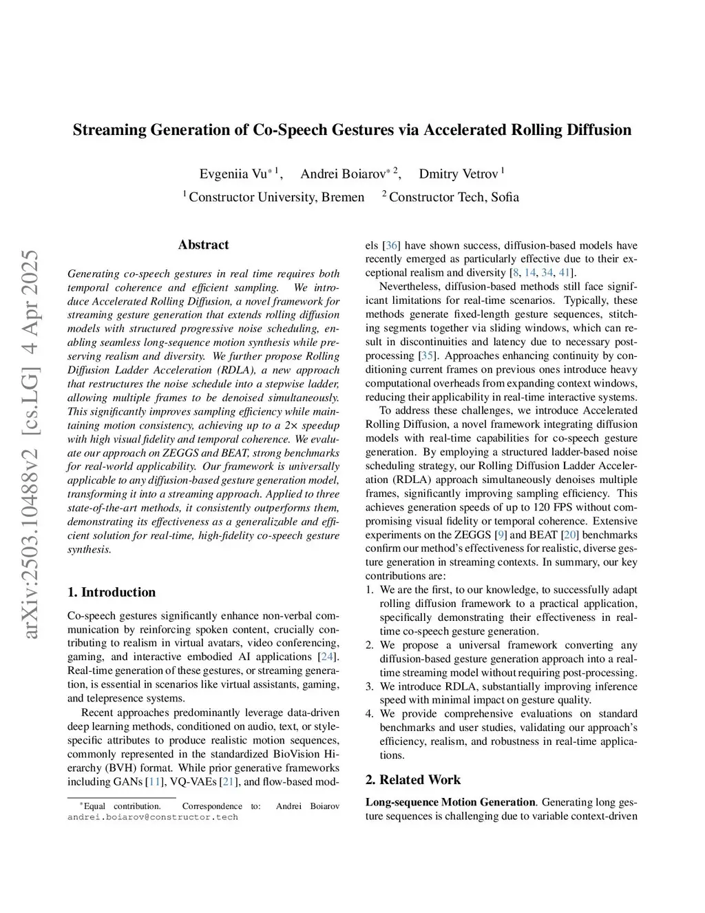 Generating co-speech gestures in real time requires both temporal coherence and efficient sampling. We introduce a novel framework for streaming gesture generation that extends Rolling Diffusion models with structured progressive noise scheduling, enabling seamless long-sequence motion synthesis while preserving realism and diversity. Our framework is universally compatible with existing diffusion-based gesture generation model, transforming them into streaming methods capable of continuous generation without requiring post-processing. We evaluate our framework on ZEGGS and BEAT, strong benchmarks for real-world applicability. Applied to state-of-the-art baselines on both datasets, it consistently outperforms them, demonstrating its effectiveness as a generalizable and efficient solution for real-time co-speech gesture synthesis. We further propose Rolling Diffusion Ladder Acceleration (RDLA), a new approach that employs a ladder-based noise scheduling strategy to simultaneously denoise multiple frames. This significantly improves sampling efficiency while maintaining motion consistency, achieving up to a 4x speedup with high visual fidelity and temporal coherence in our experiments. Comprehensive user studies further validate our framework ability to generate realistic, diverse gestures closely synchronized with the audio input.