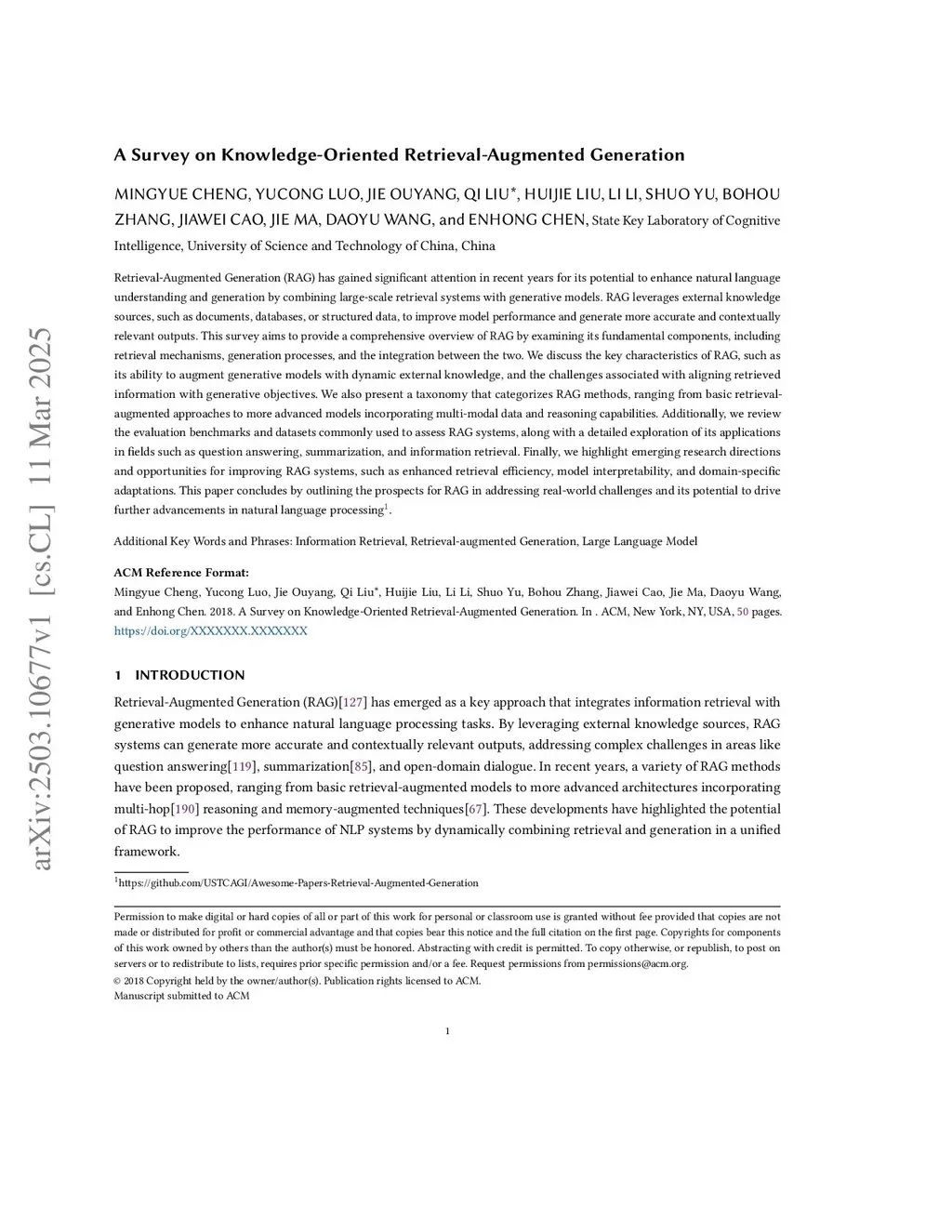 Retrieval-Augmented Generation (RAG) has gained significant attention in recent years for its potential to enhance natural language understanding and generation by combining large-scale retrieval systems with generative models. RAG leverages external knowledge sources, such as documents, databases, or structured data, to improve model performance and generate more accurate and contextually relevant outputs. This survey aims to provide a comprehensive overview of RAG by examining its fundamental components, including retrieval mechanisms, generation processes, and the integration between the two. We discuss the key characteristics of RAG, such as its ability to augment generative models with dynamic external knowledge, and the challenges associated with aligning retrieved information with generative objectives. We also present a taxonomy that categorizes RAG methods, ranging from basic retrieval-augmented approaches to more advanced models incorporating multi-modal data and reasoning capabilities. Additionally, we review the evaluation benchmarks and datasets commonly used to assess RAG systems, along with a detailed exploration of its applications in fields such as question answering, summarization, and information retrieval. Finally, we highlight emerging research directions and opportunities for improving RAG systems, such as enhanced retrieval efficiency, model interpretability, and domain-specific adaptations. This paper concludes by outlining the prospects for RAG in addressing real-world challenges and its potential to drive further advancements in natural language processing.