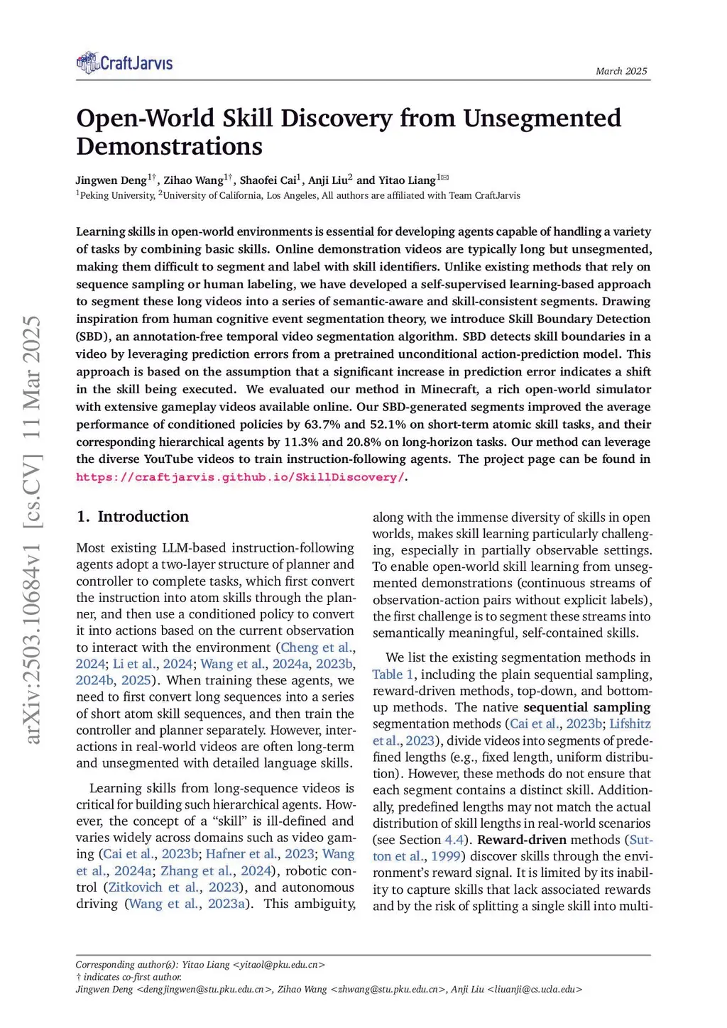 Learning skills in open-world environments is essential for developing agents capable of handling a variety of tasks by combining basic skills. Online demonstration videos are typically long but unsegmented, making them difficult to segment and label with skill identifiers. Unlike existing methods that rely on sequence sampling or human labeling, we have developed a self-supervised learning-based approach to segment these long videos into a series of semantic-aware and skill-consistent segments. Drawing inspiration from human cognitive event segmentation theory, we introduce Skill Boundary Detection (SBD), an annotation-free temporal video segmentation algorithm. SBD detects skill boundaries in a video by leveraging prediction errors from a pretrained unconditional action-prediction model. This approach is based on the assumption that a significant increase in prediction error indicates a shift in the skill being executed. We evaluated our method in Minecraft, a rich open-world simulator with extensive gameplay videos available online. Our SBD-generated segments improved the average performance of conditioned policies by 63.7% and 52.1% on short-term atomic skill tasks, and their corresponding hierarchical agents by 11.3% and 20.8% on long-horizon tasks. Our method can leverage the diverse YouTube videos to train instruction-following agents. The project page can be found inthis https URL.