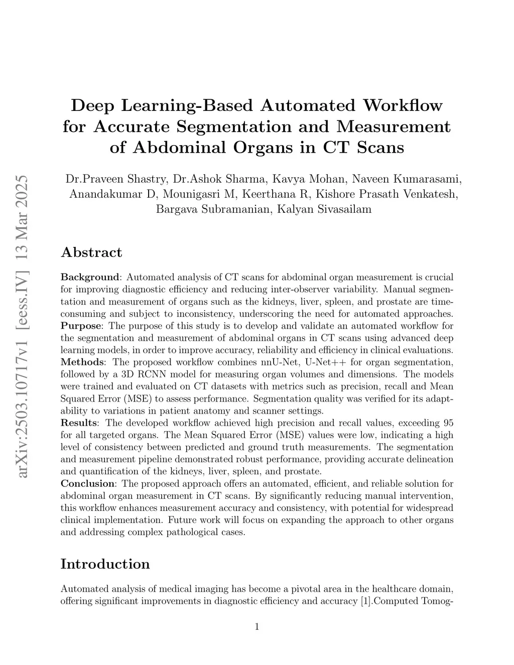 Background: Automated analysis of CT scans for abdominal organ measurement is crucial for improving diagnostic efficiency and reducing inter-observer variability. Manual segmentation and measurement of organs such as the kidneys, liver, spleen, and prostate are time-consuming and subject to inconsistency, underscoring the need for automated approaches.Purpose: The purpose of this study is to develop and validate an automated workflow for the segmentation and measurement of abdominal organs in CT scans using advanced deep learning models, in order to improve accuracy, reliability, and efficiency in clinical evaluations.Methods: The proposed workflow combines nnU-Net, U-Net++ for organ segmentation, followed by a 3D RCNN model for measuring organ volumes and dimensions. The models were trained and evaluated on CT datasets with metrics such as precision, recall, and Mean Squared Error (MSE) to assess performance. Segmentation quality was verified for its adaptability to variations in patient anatomy and scanner settings.Results: The developed workflow achieved high precision and recall values, exceeding 95 for all targeted organs. The Mean Squared Error (MSE) values were low, indicating a high level of consistency between predicted and ground truth measurements. The segmentation and measurement pipeline demonstrated robust performance, providing accurate delineation and quantification of the kidneys, liver, spleen, and prostate.Conclusion: The proposed approach offers an automated, efficient, and reliable solution for abdominal organ measurement in CT scans. By significantly reducing manual intervention, this workflow enhances measurement accuracy and consistency, with potential for widespread clinical implementation. Future work will focus on expanding the approach to other organs and addressing complex pathological cases.