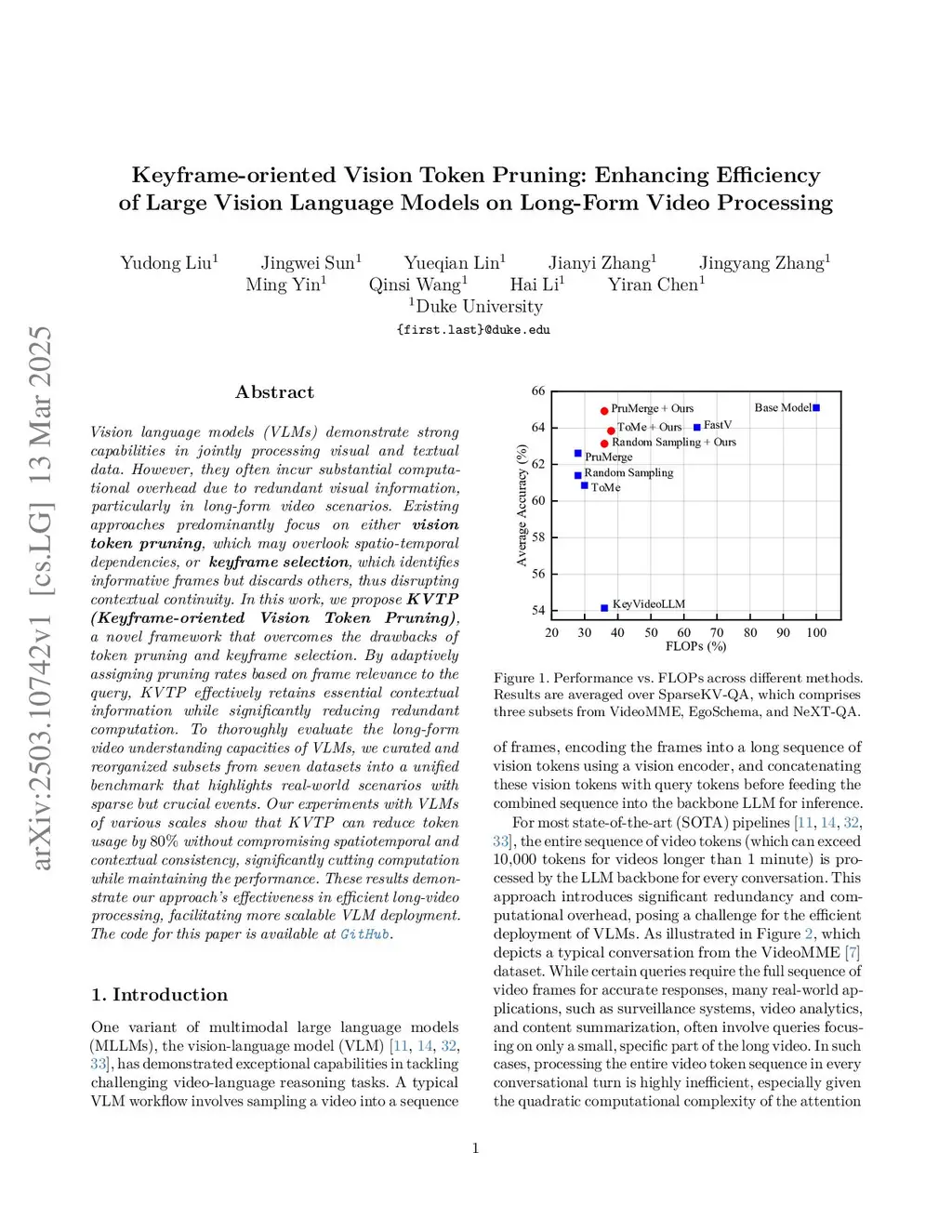 Vision language models (VLMs) demonstrate strong capabilities in jointly processing visual and textual data. However, they often incur substantial computational overhead due to redundant visual information, particularly in long-form video scenarios. Existing approaches predominantly focus on either vision token pruning, which may overlook spatio-temporal dependencies, or keyframe selection, which identifies informative frames but discards others, thus disrupting contextual continuity. In this work, we propose KVTP (Keyframe-oriented Vision Token Pruning), a novel framework that overcomes the drawbacks of token pruning and keyframe selection. By adaptively assigning pruning rates based on frame relevance to the query, KVTP effectively retains essential contextual information while significantly reducing redundant computation. To thoroughly evaluate the long-form video understanding capacities of VLMs, we curated and reorganized subsets from VideoMME, EgoSchema, and NextQA into a unified benchmark named SparseKV-QA that highlights real-world scenarios with sparse but crucial events. Our experiments with VLMs of various scales show that KVTP can reduce token usage by 80% without compromising spatiotemporal and contextual consistency, significantly cutting computation while maintaining the performance. These results demonstrate our approach's effectiveness in efficient long-video processing, facilitating more scalable VLM deployment.