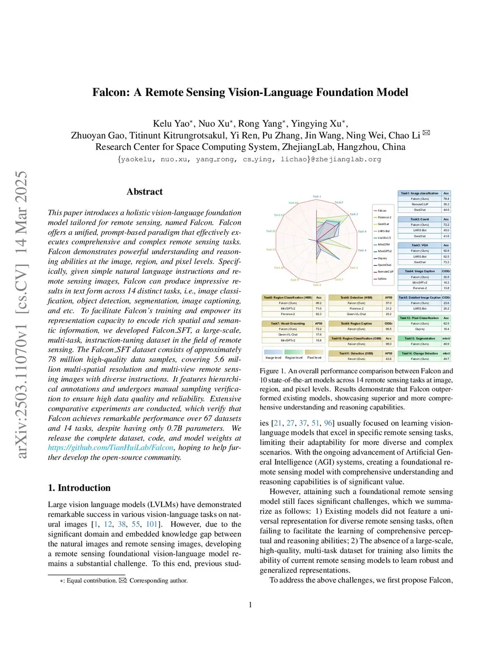 This paper introduces a holistic vision-language foundation model tailored for remote sensing, named Falcon. Falcon offers a unified, prompt-based paradigm that effectively executes comprehensive and complex remote sensing tasks. Falcon demonstrates powerful understanding and reasoning abilities at the image, region, and pixel levels. Specifically, given simple natural language instructions and remote sensing images, Falcon can produce impressive results in text form across 14 distinct tasks, i.e., image classification, object detection, segmentation, image captioning, and etc. To facilitate Falcon's training and empower its representation capacity to encode rich spatial and semantic information, we developed Falcon_SFT, a large-scale, multi-task, instruction-tuning dataset in the field of remote sensing. The Falcon_SFT dataset consists of approximately 78 million high-quality data samples, covering 5.6 million multi-spatial resolution and multi-view remote sensing images with diverse instructions. It features hierarchical annotations and undergoes manual sampling verification to ensure high data quality and reliability. Extensive comparative experiments are conducted, which verify that Falcon achieves remarkable performance over 67 datasets and 14 tasks, despite having only 0.7B parameters. We release the complete dataset, code, and model weights atthis https URL, hoping to help further develop the open-source community.