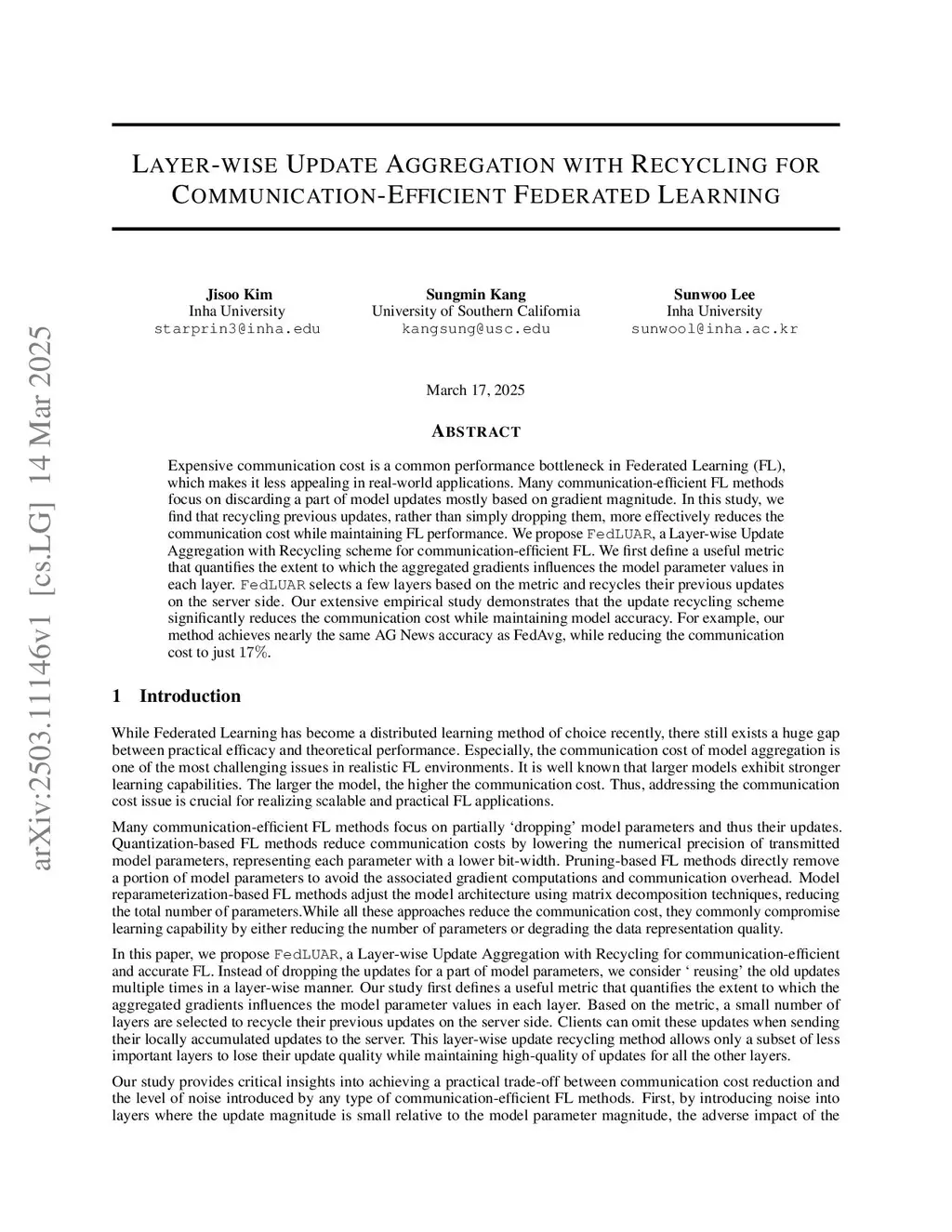 Expensive communication cost is a common performance bottleneck in Federated Learning (FL), which makes it less appealing in real-world applications. Many communication-efficient FL methods focus on discarding a part of model updates mostly based on gradient magnitude. In this study, we find that recycling previous updates, rather than simply dropping them, more effectively reduces the communication cost while maintaining FL performance. We propose FedLUAR, a Layer-wise Update Aggregation with Recycling scheme for communication-efficient FL. We first define a useful metric that quantifies the extent to which the aggregated gradients influences the model parameter values in each layer. FedLUAR selects a few layers based on the metric and recycles their previous updates on the server side. Our extensive empirical study demonstrates that the update recycling scheme significantly reduces the communication cost while maintaining model accuracy. For example, our method achieves nearly the same AG News accuracy as FedAvg, while reducing the communication cost to just 17%.