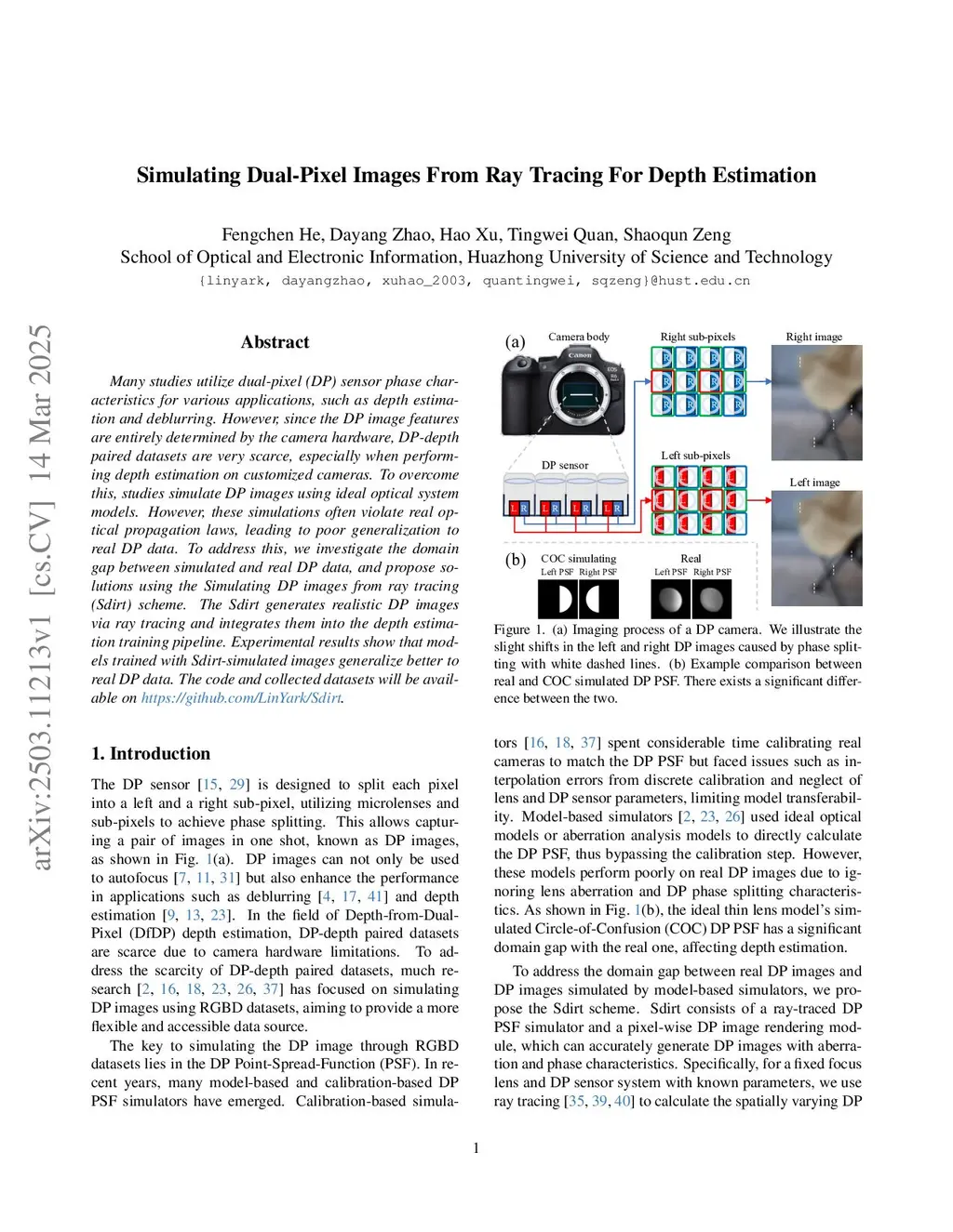 Many studies utilize dual-pixel (DP) sensor phase characteristics for various applications, such as depth estimation and deblurring. However, since the DP image features are entirely determined by the camera hardware, DP-depth paired datasets are very scarce, especially when performing depth estimation on customized cameras. To overcome this, studies simulate DP images using ideal optical system models. However, these simulations often violate real optical propagation laws, leading to poor generalization to real DP data. To address this, we investigate the domain gap between simulated and real DP data, and propose solutions using the Simulating DP images from ray tracing (Sdirt) scheme. The Sdirt generates realistic DP images via ray tracing and integrates them into the depth estimation training pipeline. Experimental results show that models trained with Sdirt-simulated images generalize better to real DP data. The code and collected datasets will be available atthis http URL