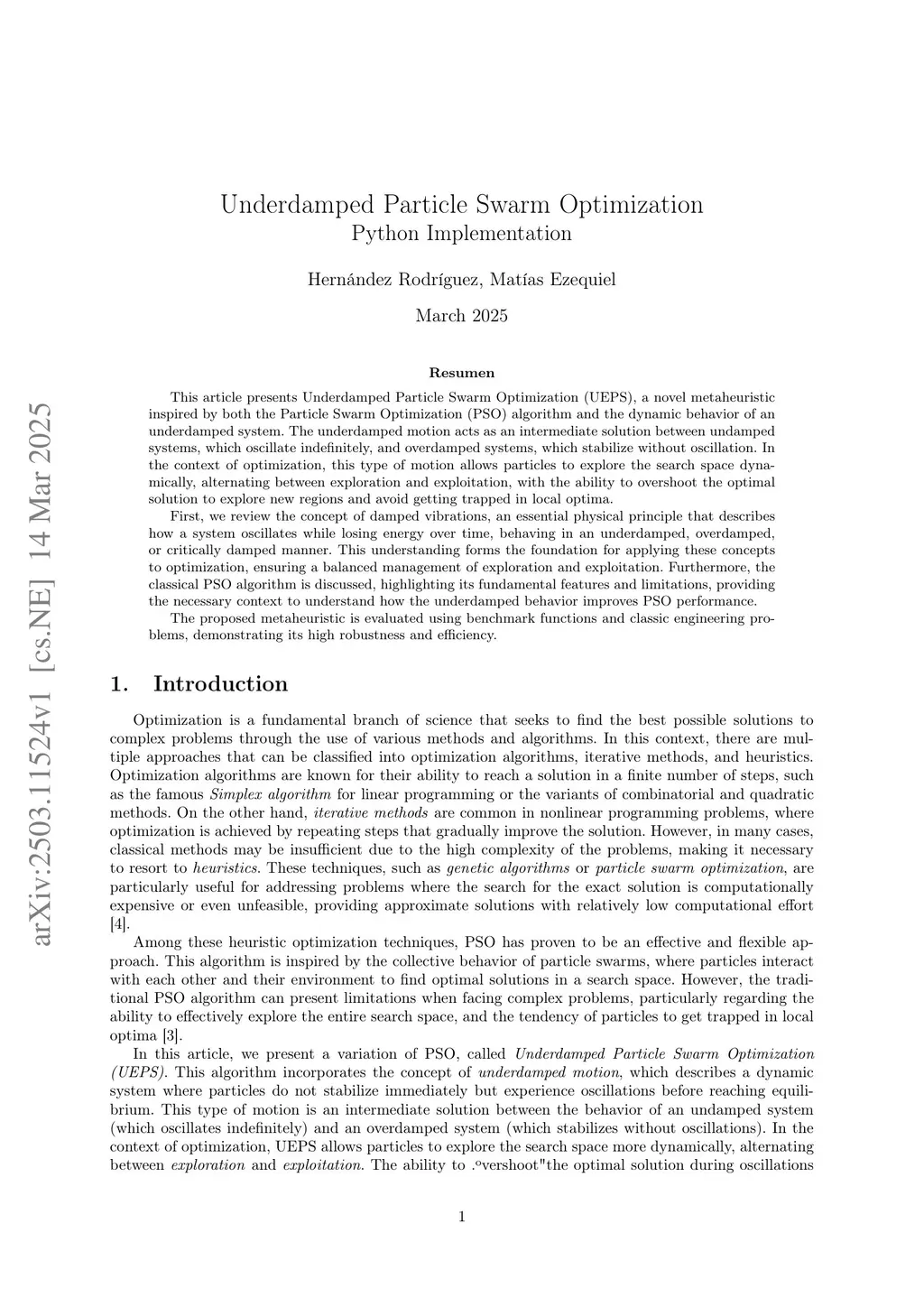 This article presents Underdamped Particle Swarm Optimization (UEPS), a novel metaheuristic inspired by both the Particle Swarm Optimization (PSO) algorithm and the dynamic behavior of an underdamped system. The underdamped motion acts as an intermediate solution between undamped systems, which oscillate indefinitely, and overdamped systems, which stabilize without oscillation. In the context of optimization, this type of motion allows particles to explore the search space dynamically, alternating between exploration and exploitation, with the ability to overshoot the optimal solution to explore new regions and avoid getting trapped in local optima.First, we review the concept of damped vibrations, an essential physical principle that describes how a system oscillates while losing energy over time, behaving in an underdamped, overdamped, or critically damped manner. This understanding forms the foundation for applying these concepts to optimization, ensuring a balanced management of exploration and exploitation. Furthermore, the classical PSO algorithm is discussed, highlighting its fundamental features and limitations, providing the necessary context to understand how the underdamped behavior improves PSO performance.The proposed metaheuristic is evaluated using benchmark functions and classic engineering problems, demonstrating its high robustness and efficiency.